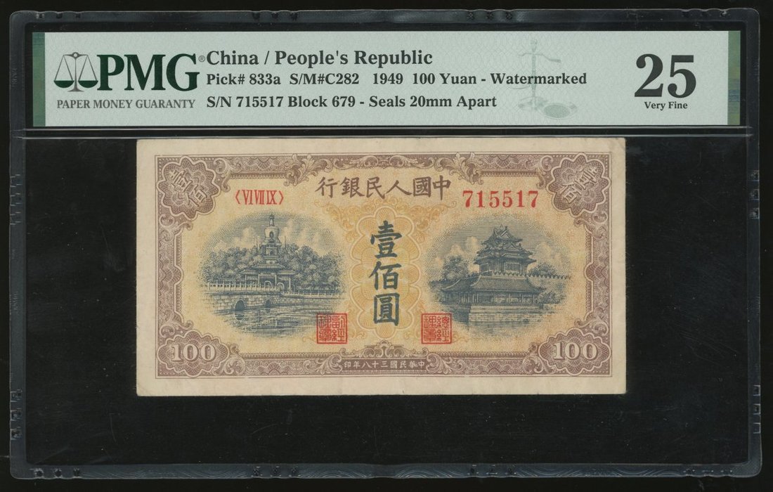 People's Bank of China, 1st series renminbi, 1949, 100 yuan, 'Yellow Bei Hai Bridge', narrow seals, radar serial number VI VII IX 715517, (Pick 833a), PMG 25 Very Fine.
