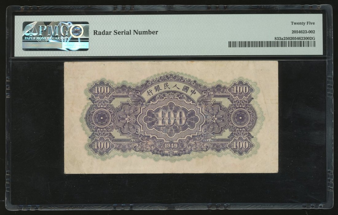 1949年中國人民銀行第一版人民幣100元「黃北海橋」,窄章距版,雷達號VI VII IX 715517,PMG 25