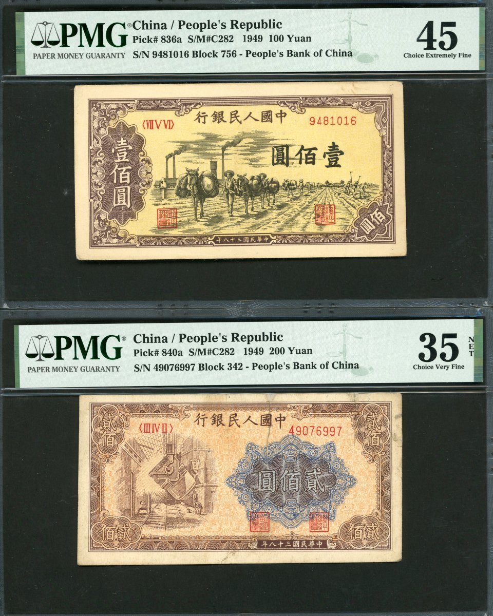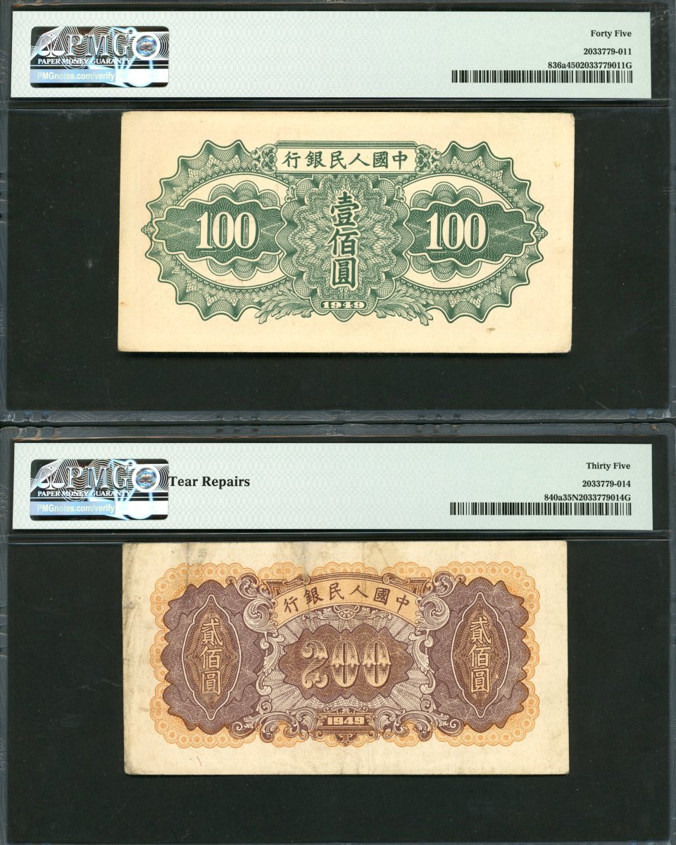 1949年中國人民銀行第一版人民幣100元「驢運」及200元「鍊鋼」,編號VII V VI 9481016及III IV II 49076997,分別PMG 45及35NET有修補