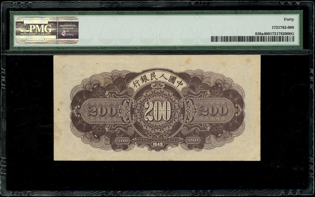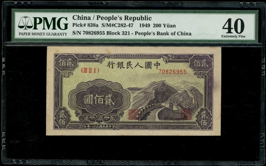 1949年中國人民銀行第一版人民幣200元「長城」,編號III II I 70826955,PMG 40