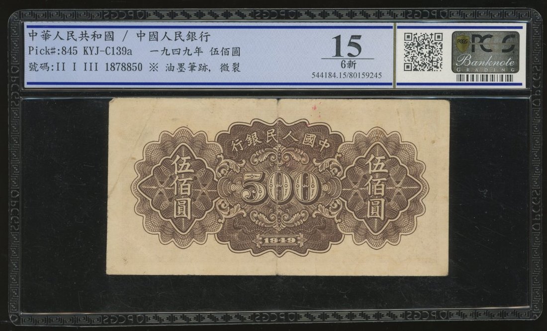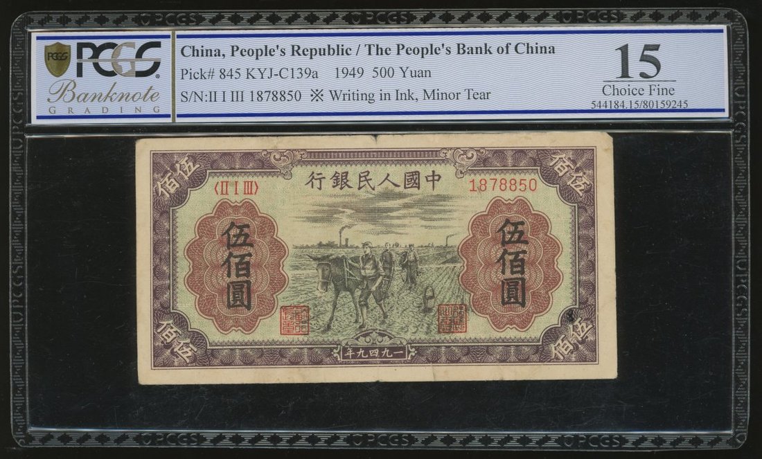 1949年中國人民銀行第一版人民幣500元「種地」,編號II I III 1878850,PCGS Banknote Grading 15,有墨水書寫及輕微裂痕