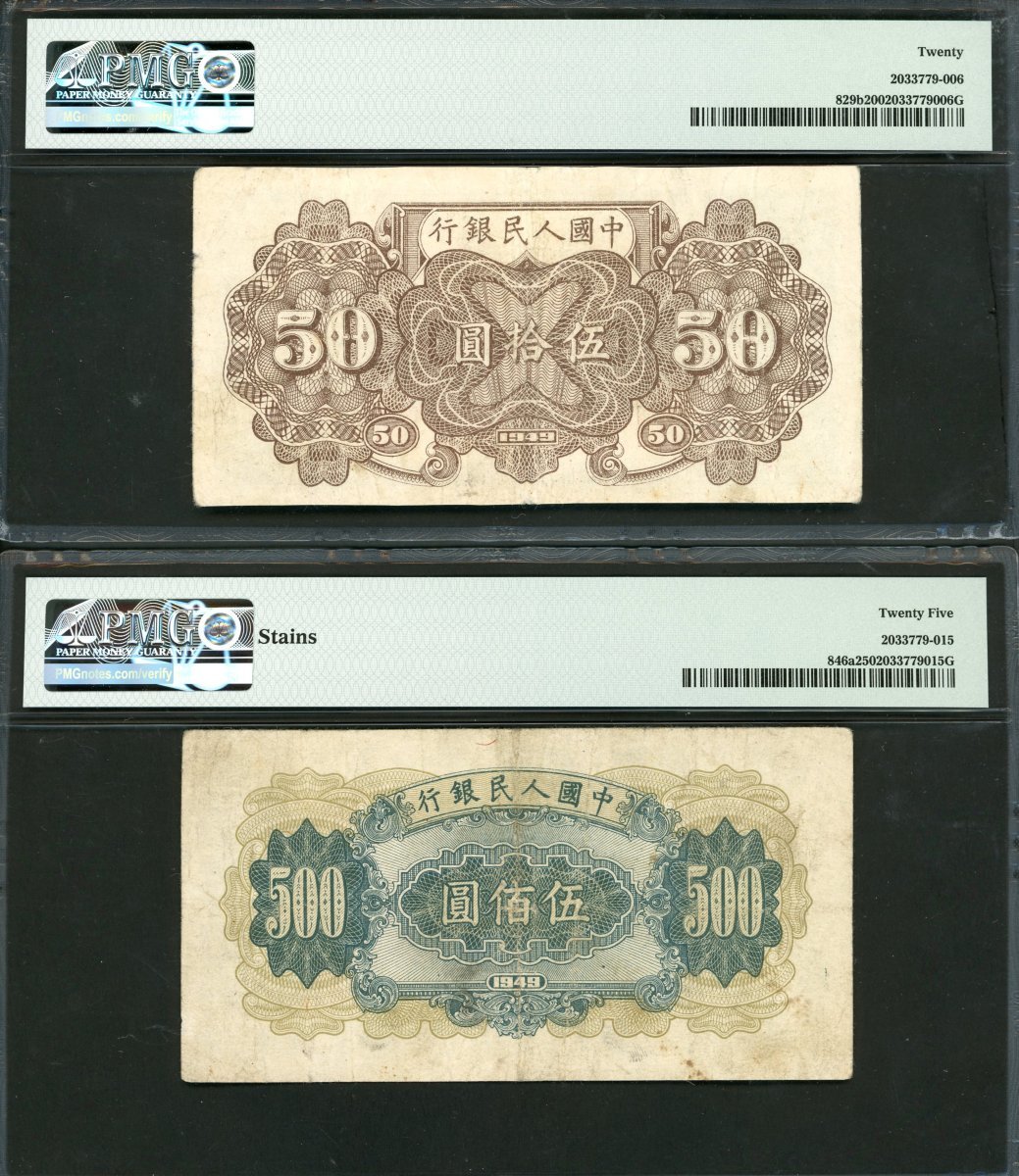1949年中國人民銀行第一版人民幣50元「火車」及500元「拖拉機」,編號X VIII IX 5730575及I II III 41972046,分別PMG 20及25
