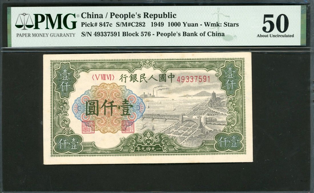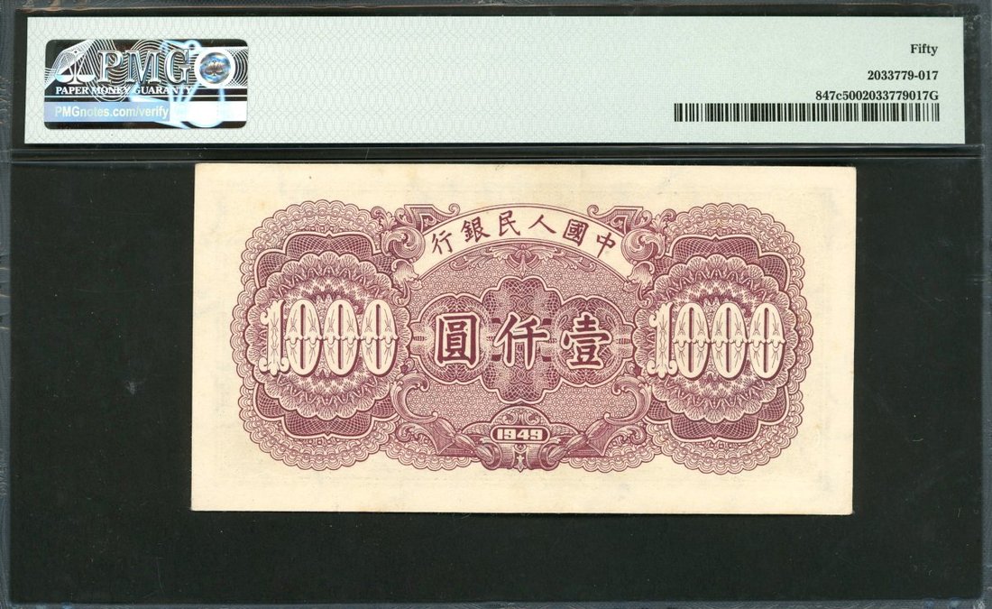 1949年中國人民銀行第一版人民幣1000元「錢塘江橋」,編號V VII VI 49337591,PMG 50