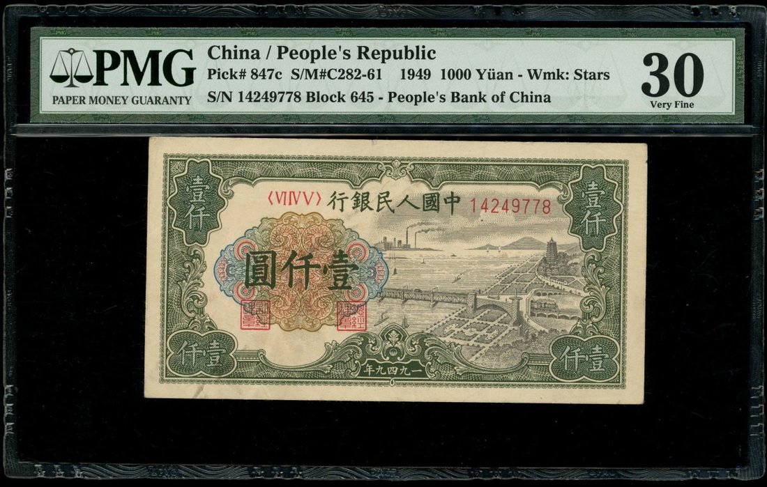 People's Bank of China, 1st series renminbi, 1949, 1000 yuan, 'Qiantang Bridge', serial number VI IV V 14249778, (Pick 847c), PMG 30 Very Fine