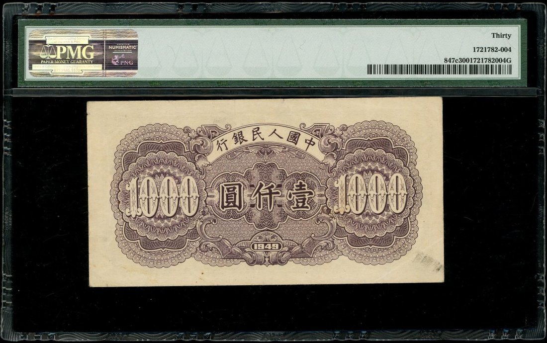 1949年中國人民銀行第一版人民幣1000元「錢塘江橋」,編號VI IV V 14249778,PMG 30
