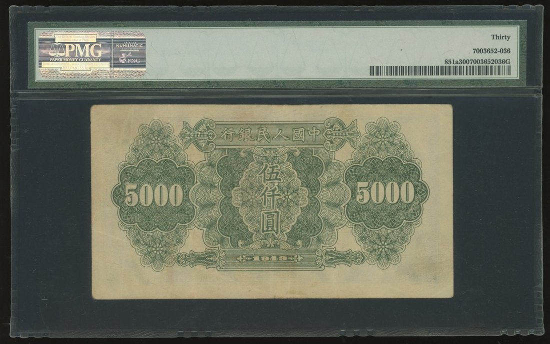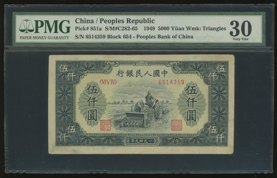 1949年中國人民銀行第一版人民幣5000元「拖拉機」,編號VI V IV 6514359,PMG 30