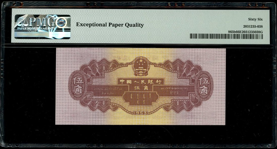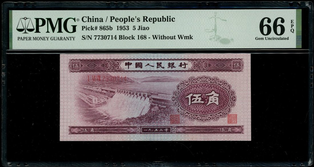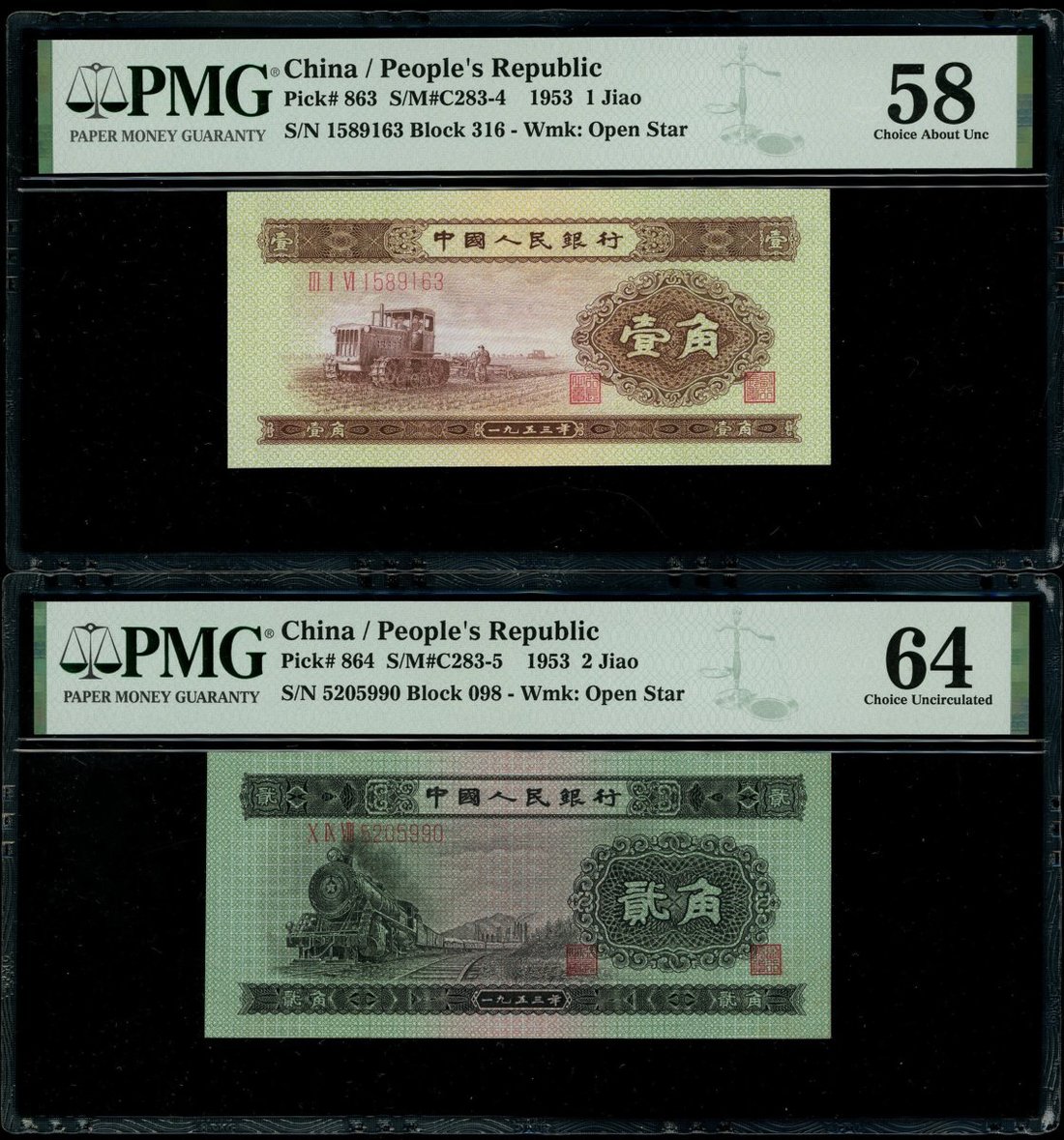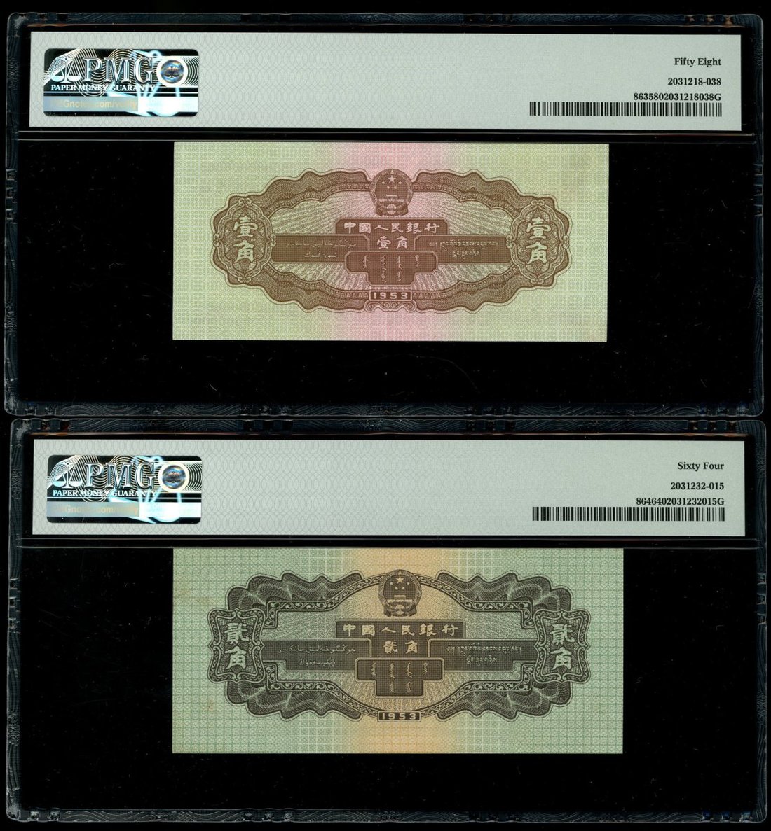 1953年中國人民銀行第二版人民幣壹角,貳角及伍角一組3枚,編號III I VI 1589163,X IX VIII 5205990及I VI VIII 7330714,分別評PMG 58,64及66EPQ
