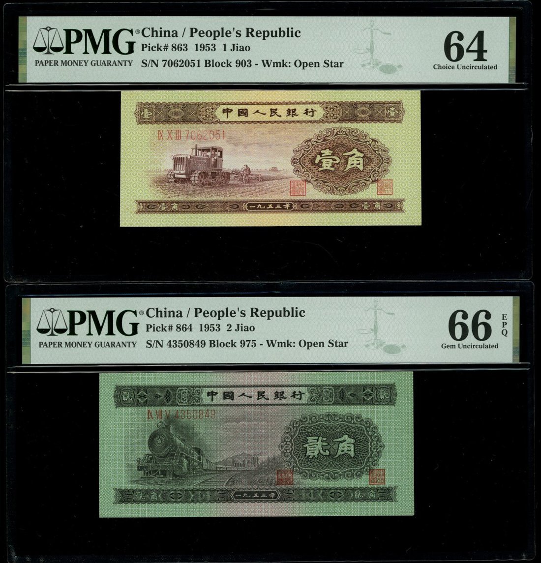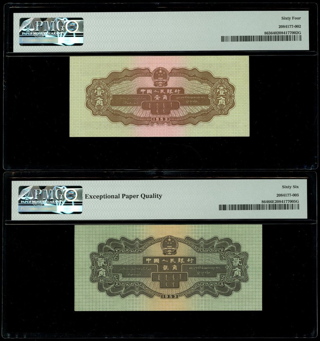 1953年中國人民銀行第二版人民幣一組3枚,包括1,2及伍角,編號IX X III 7062051,IX VII V 4350849及II IV VI 3850315,分別PMG 64,PMG 66EPQ及AU品相