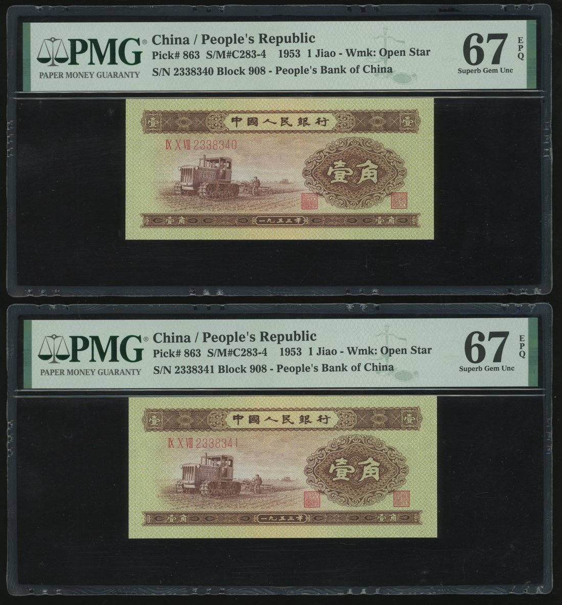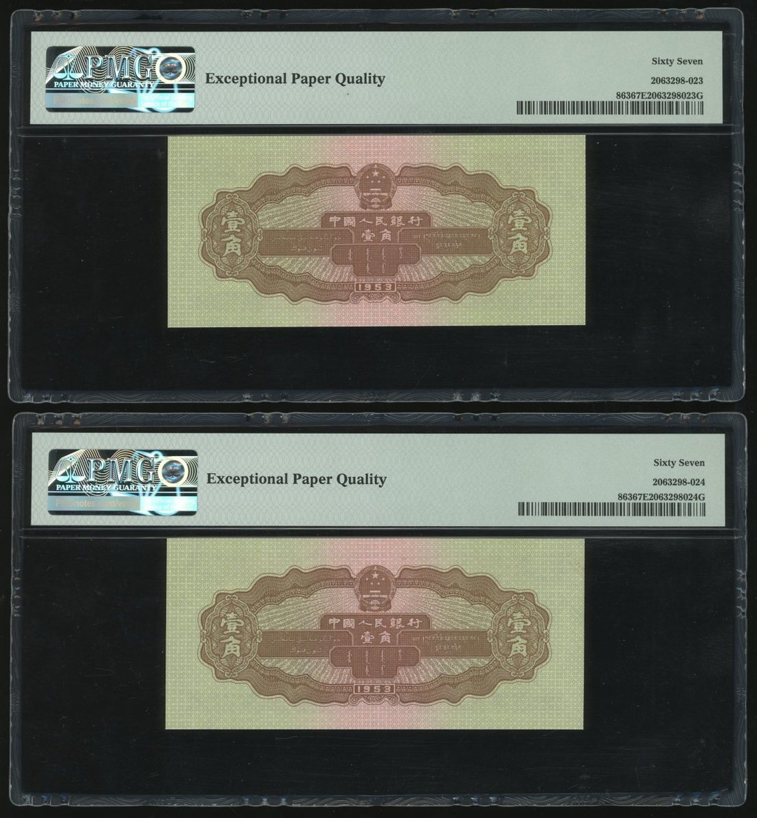 1953年中國人民銀行第二版人民幣壹角連號一對,編號IX X VIII 2338340-341,均PMG 67EPQ