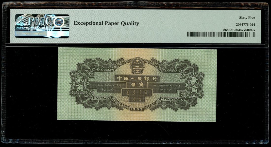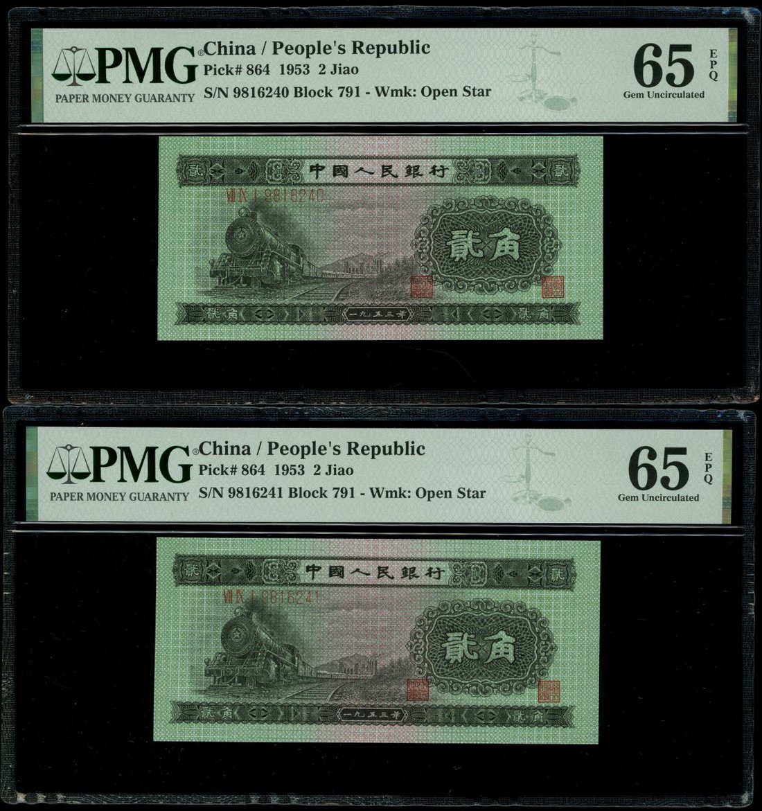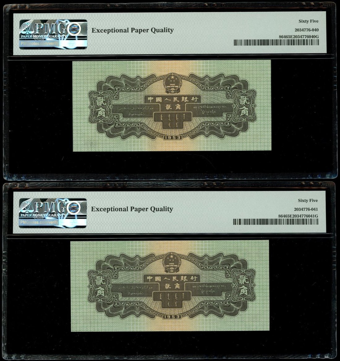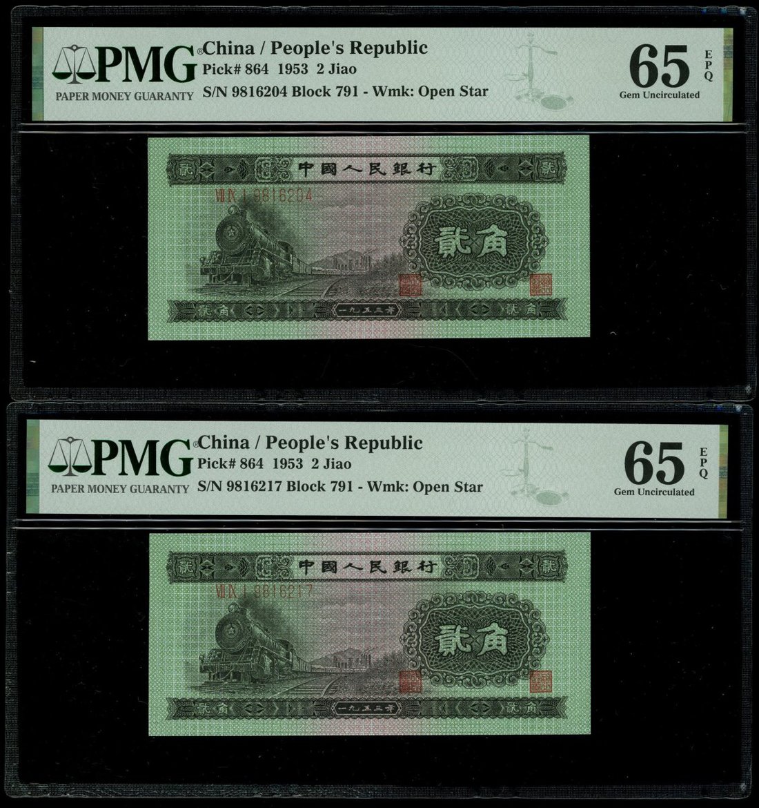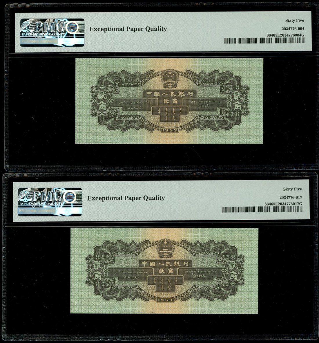 1953年中國人民銀行第二版人民幣貳角一組5枚,編號VII IX I 9816204,217,224,240-241,開星水印,均PMG 65EPQ
