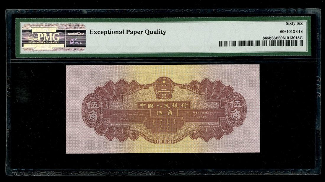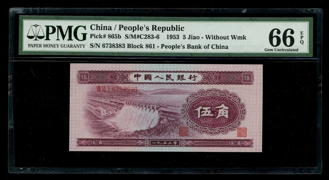1953年中國人民銀行第二版人民幣伍角,編號VIII VI I 6738383,PMG 66EPQ