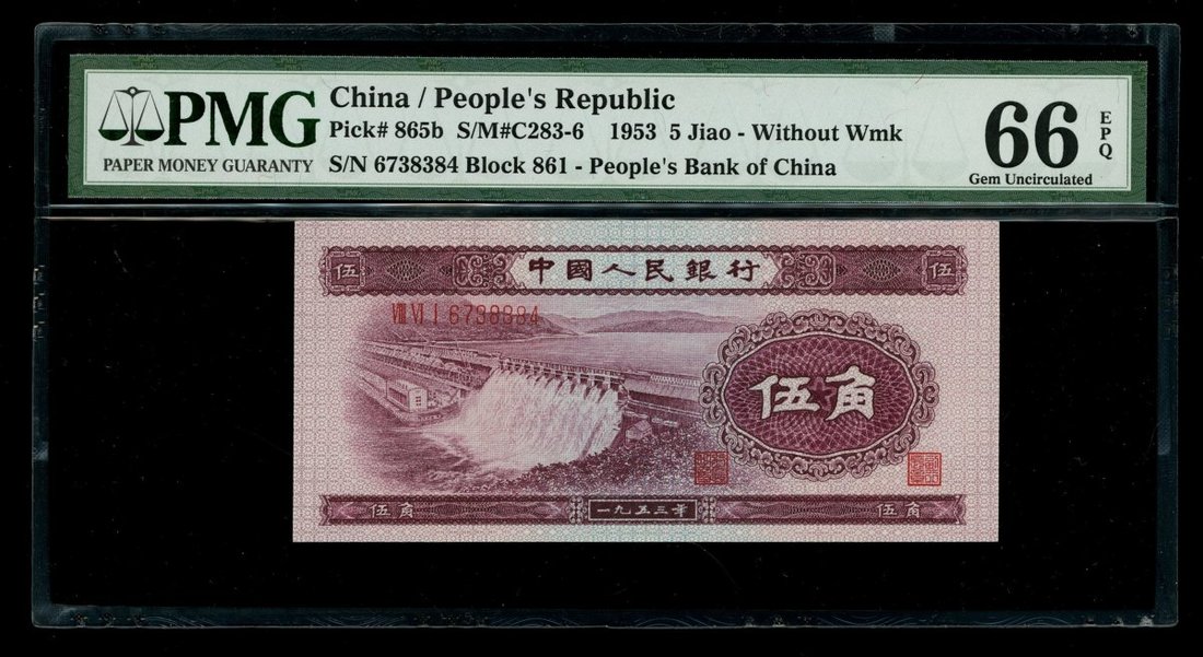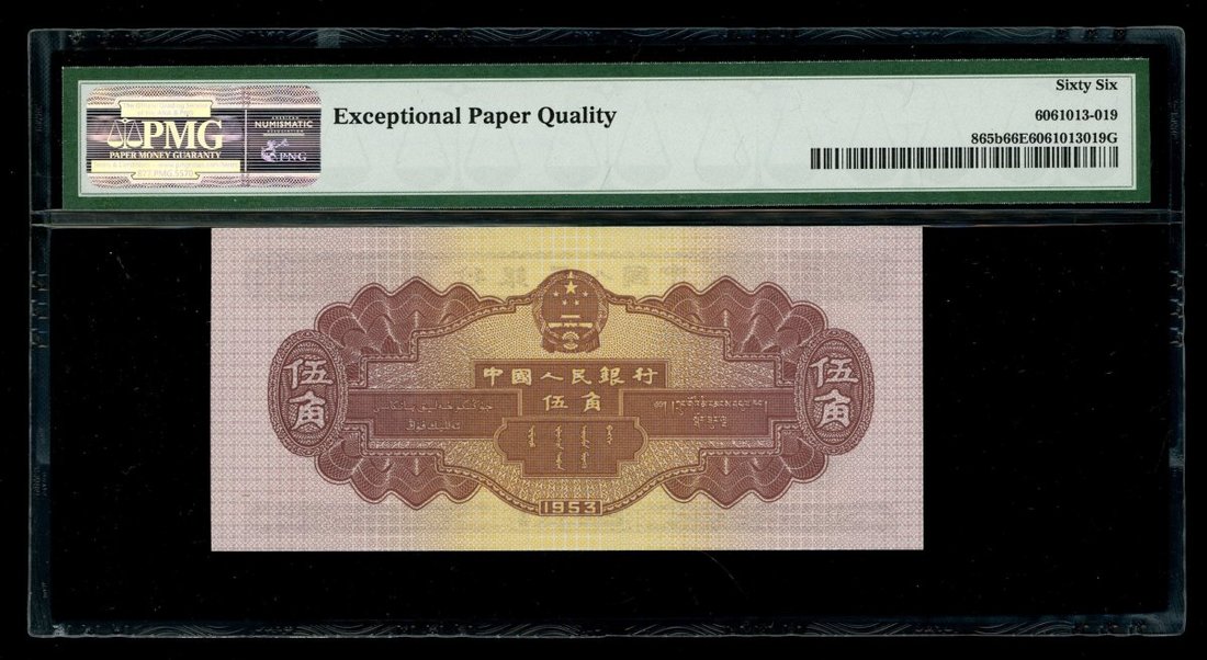 1953年中國人民銀行第二版人民幣伍角,編號VIII VI I 6738384,PMG 66EPQ