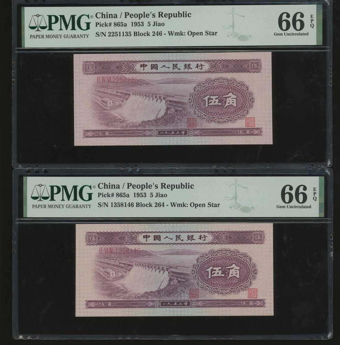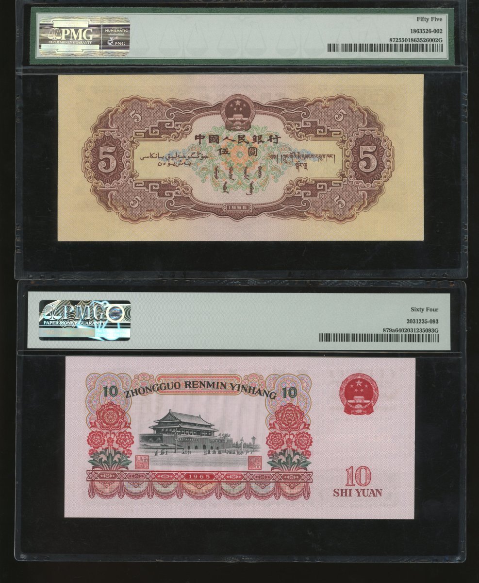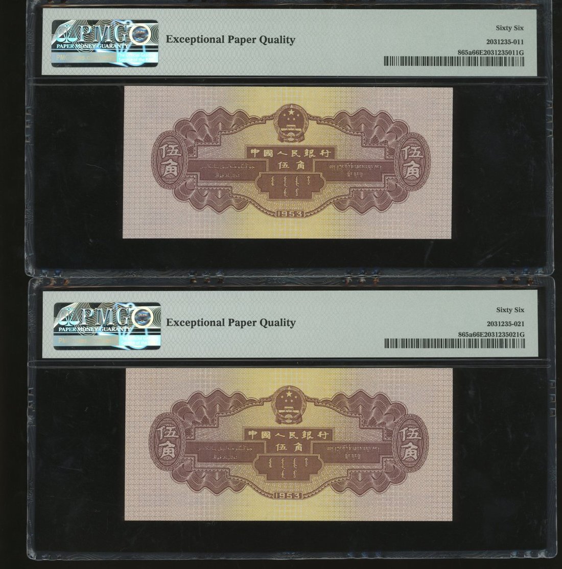 中國人民銀行紙鈔一組4枚,1953及56年第二版人民幣伍角一對,1953年5元,及1965年第三版人民幣10元,編號II IV VI 2251135,II VI IV 1358146,IV V III 0286345及VIII VI I 5382642,分別評PMG 66EPQ,66EPQ,55及64