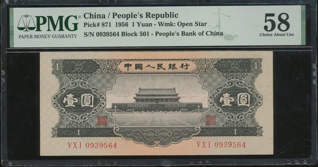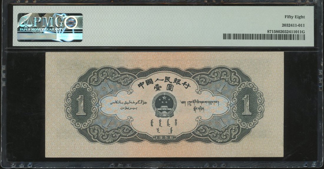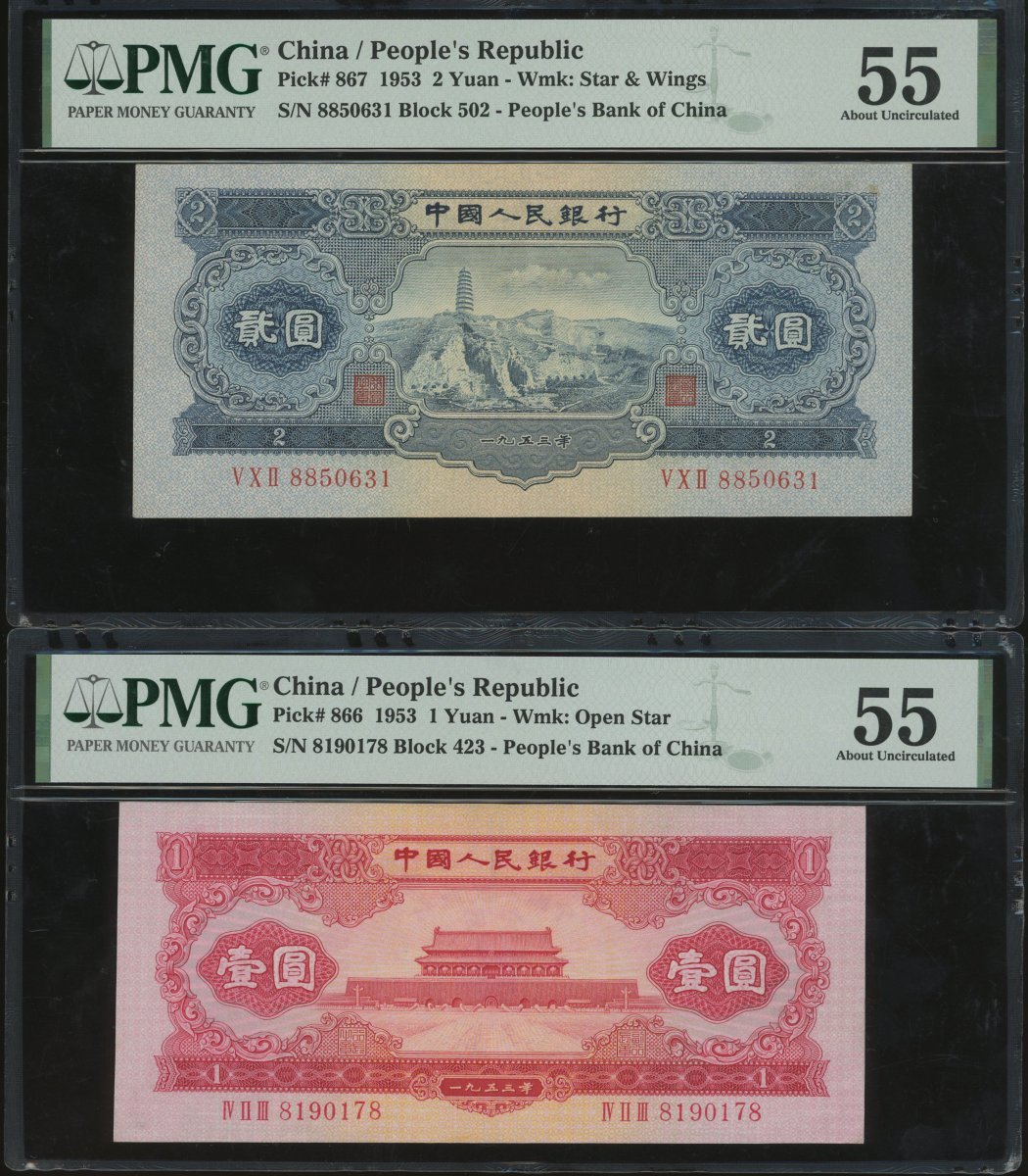 1953年中國人民銀行第二版人民幣紅壹圓及貳圓一對,及1956年壹圓,編號IV II III 8199018,V X II 8850631及V X I 0939564,分別評PMG 55,55及58