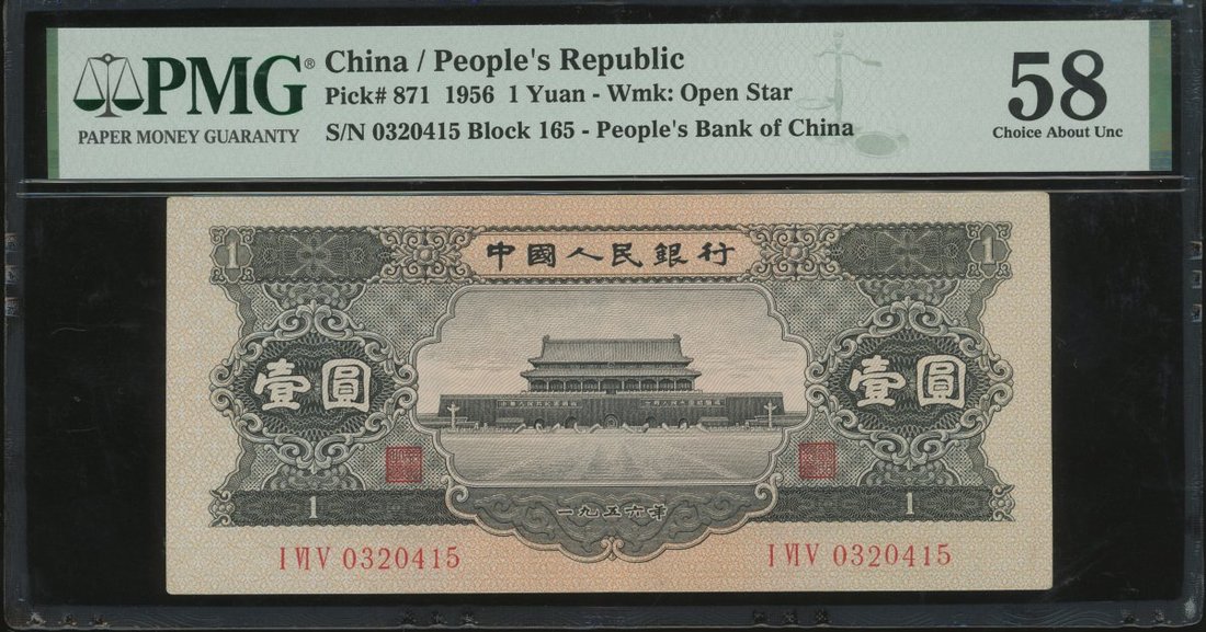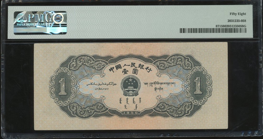 1953年中國人民銀行第二版人民幣紅壹圓及貳圓一對,及1956年壹圓,編號IV I II 2587262,III Vi II 8753278及I VI V 0320415,分別評PMG 55,58及58