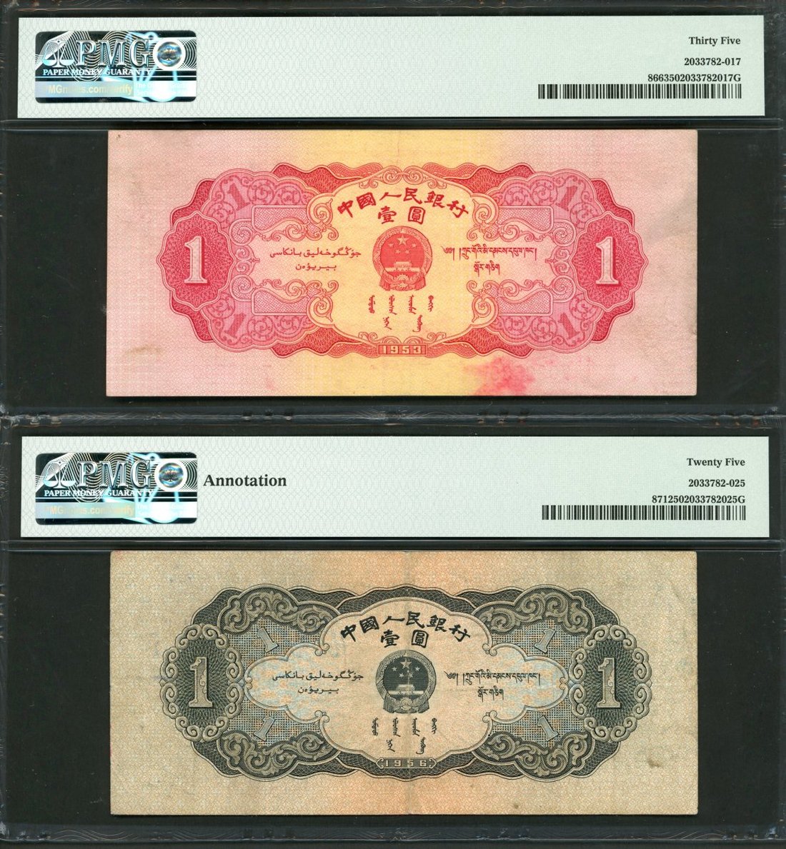 1953及1956年中國人民銀行第二版人民幣壹圓一對,編號VII VIII IX 7082360及I III IX 0703433,分別PMG 35及25(有書寫)