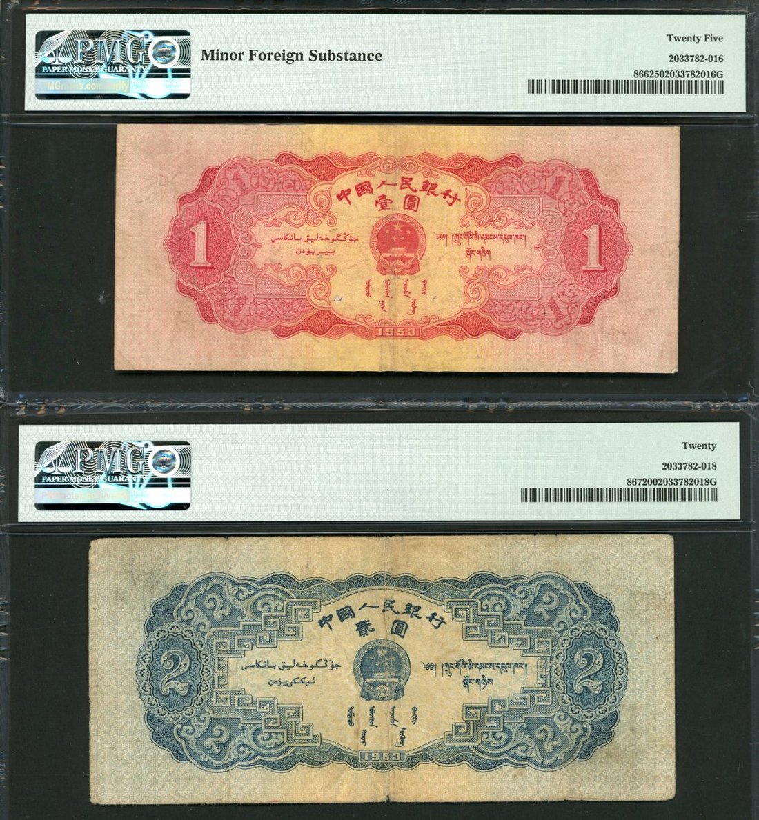 1953年中國人民銀行第二版人民幣紅壹圓及貳圓一對,編號VI VIII X 8972145及II V VIII 1912953,分別評PMG 25(帶輕微外附物)及20