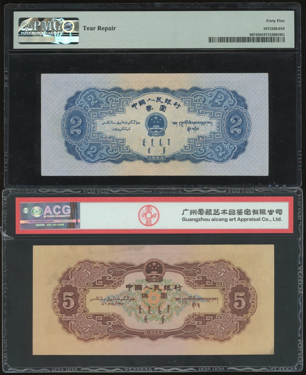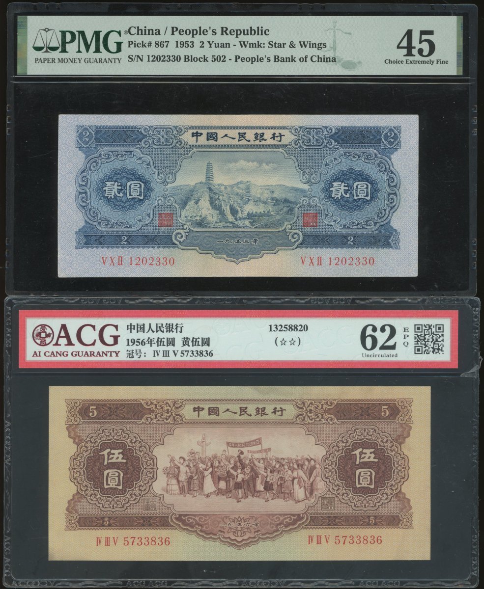 1953-56年中國人民銀行第二版人民幣貳圓及伍圓,編號V X II 1202330及IV III V 5733836,伍圓星水印,分別評PMG 45 (裂痕經修復)及ACG 64EPQ