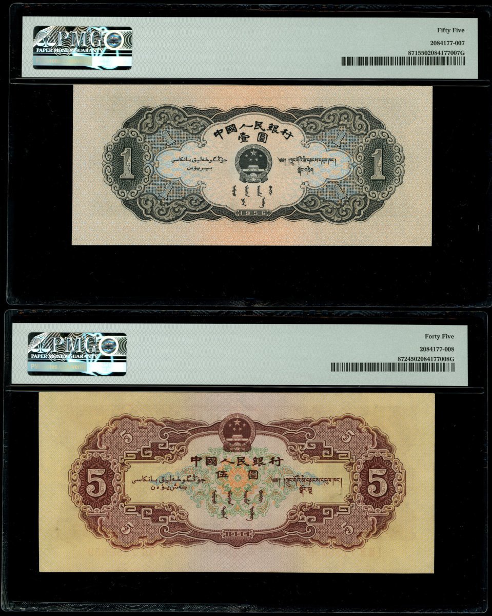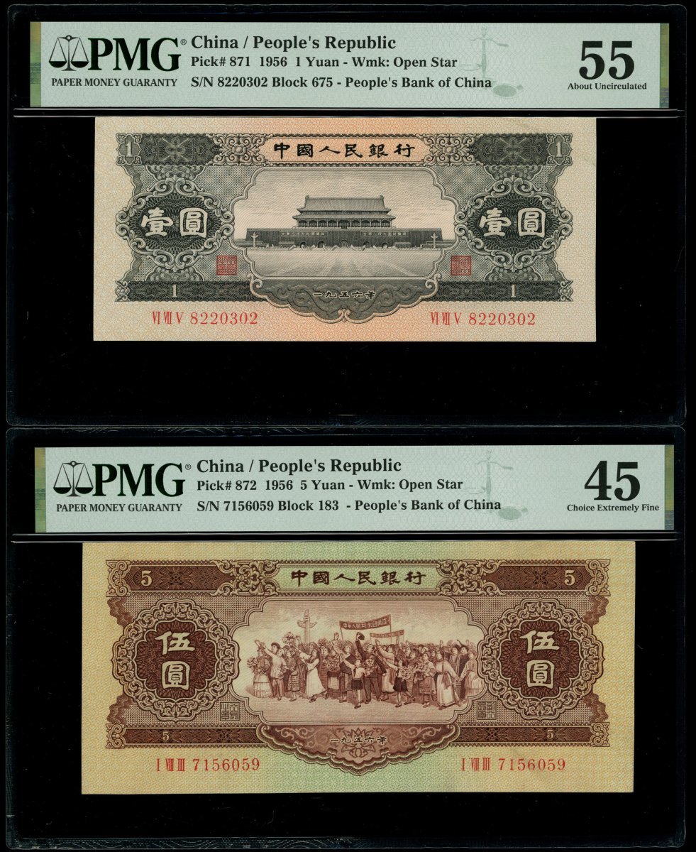 1956年中國人民銀行第二版人民幣壹圓及伍圓一對,後者星水印,編號VI VII V 8220302及I VIII III 7156059,分別評 PMG 55及45