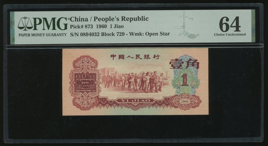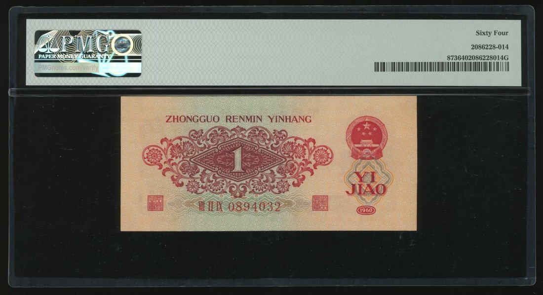1960年中國人民銀行第三版人民幣棗紅壹角,編號VII II IX 0894032,PMG 64