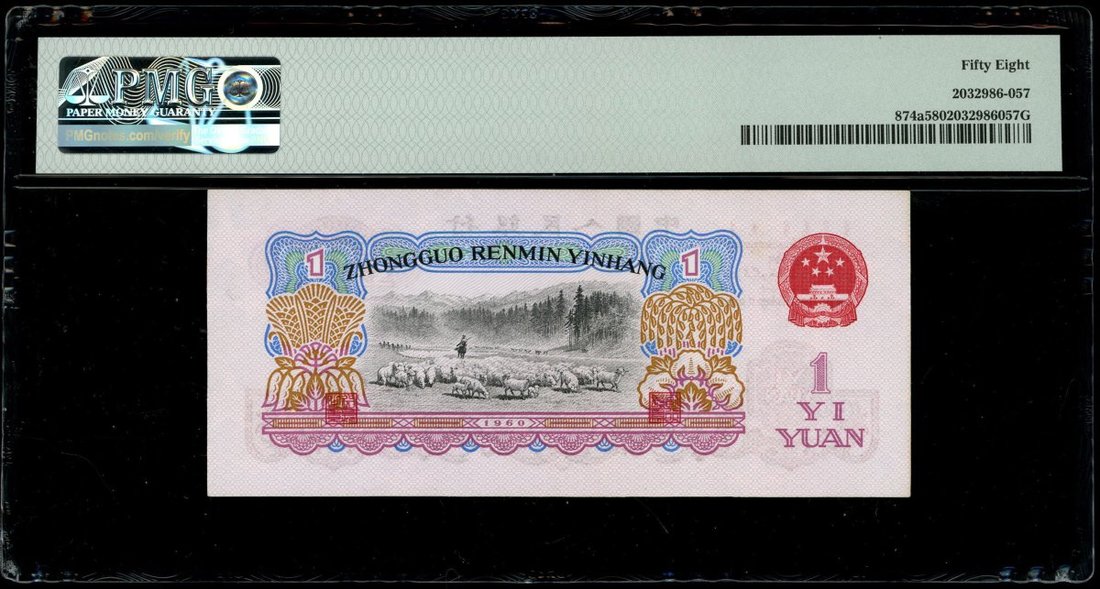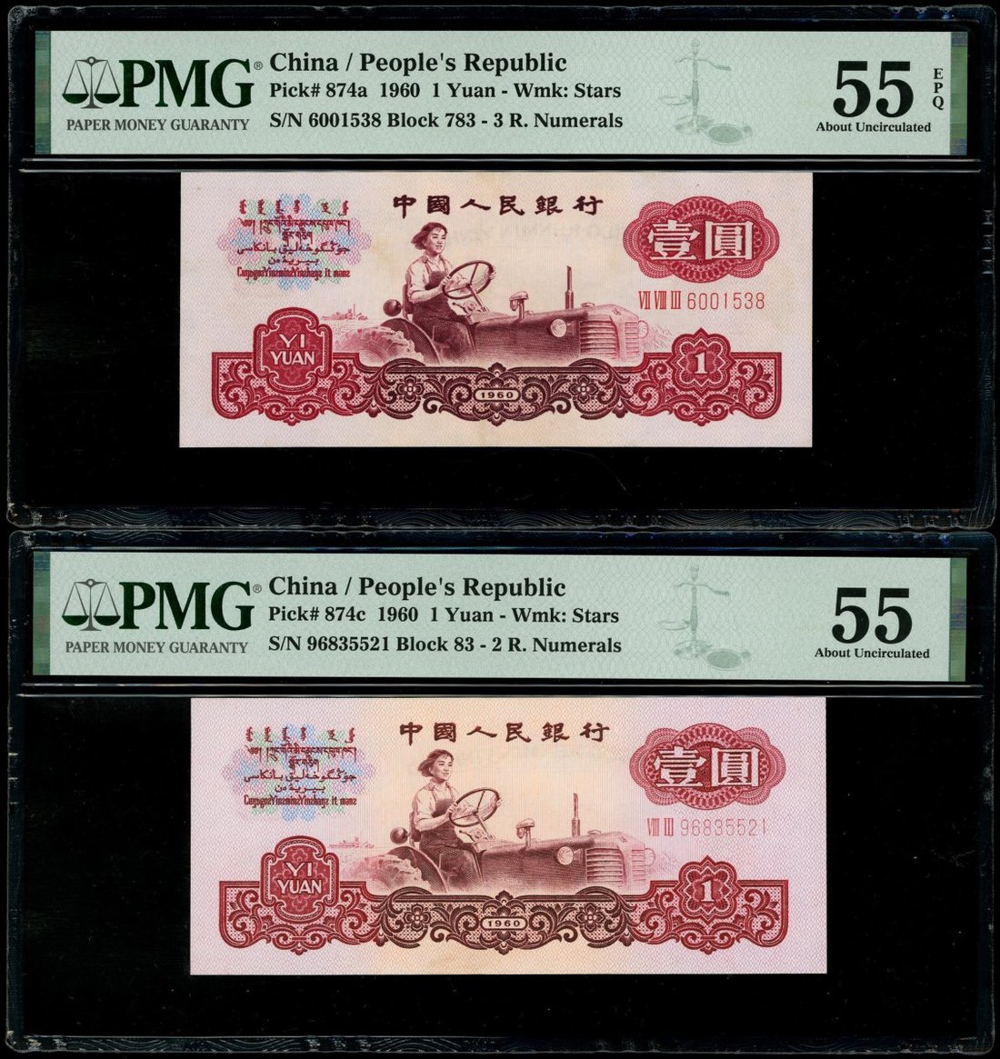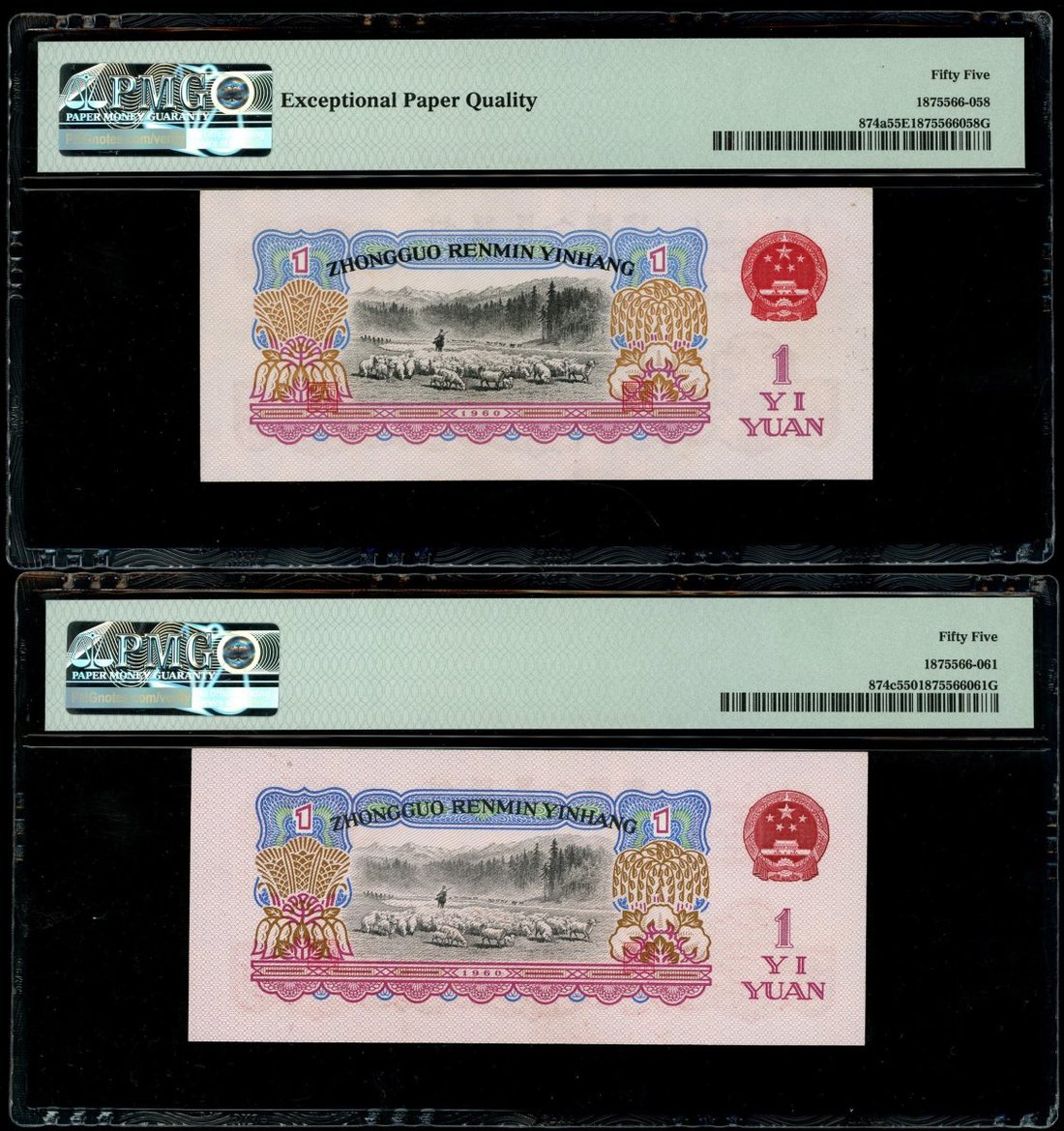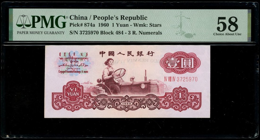 1960年中國人民銀行第三版人民幣壹圓3枚,星水印,編號IV VIII IV 3725970,VII VIII III 6001538及VIII III 96835521,分別評PMG 58,55EPQ及55