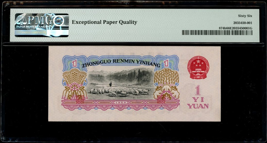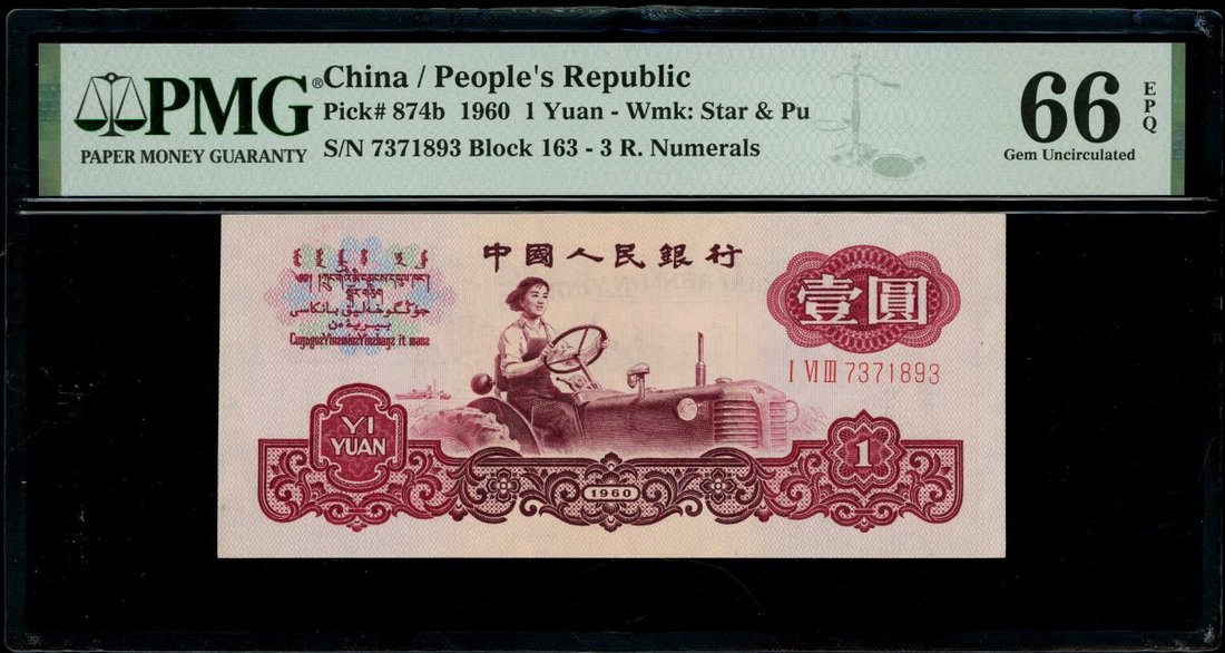 1960年中國人民銀行第三版人民幣壹圓,星及古幣水印,編號I VI III 7371893,PMG 66EPQ
