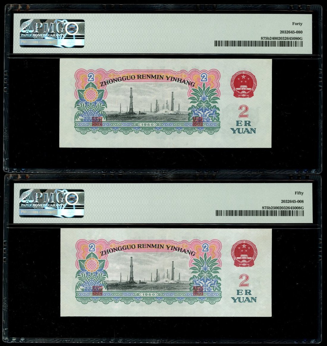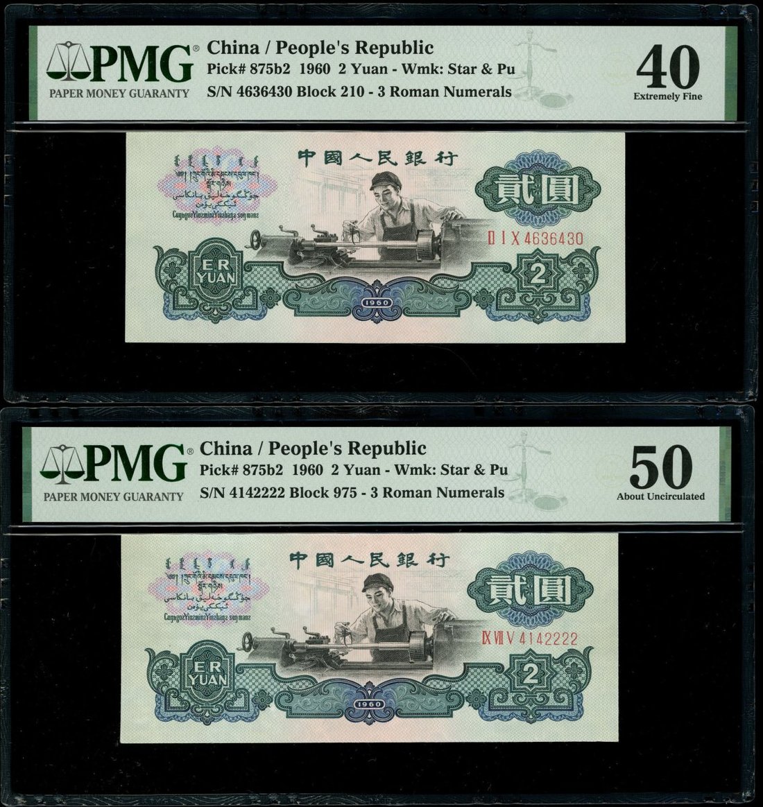 1960年中國人民銀行第三版人民幣貳圓一對,古幣水印,編號IX VII V 4142222及II I X 4636430,分別評PMG 40及50