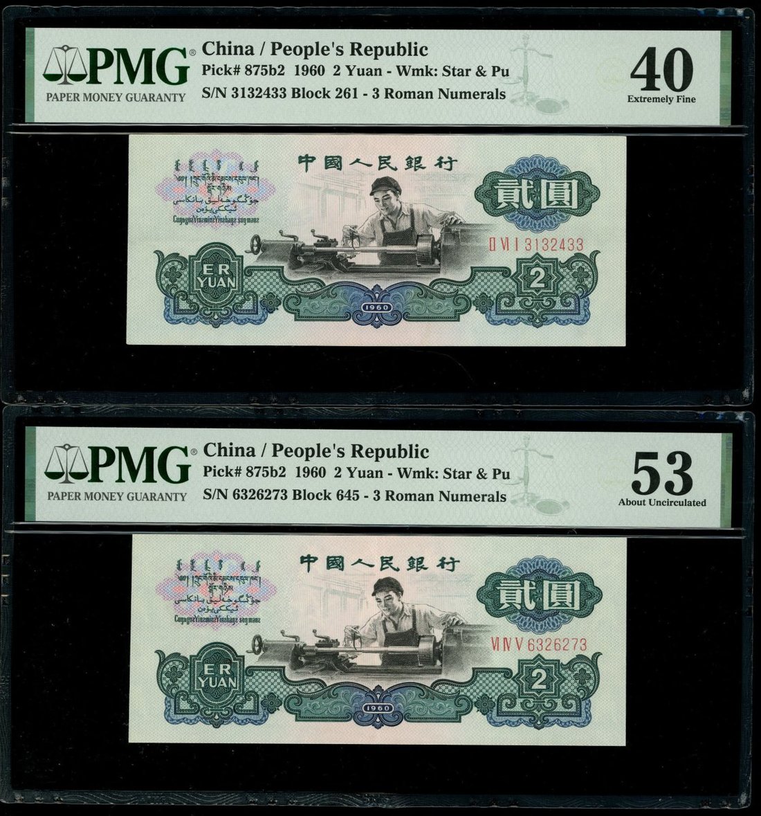 1960年中國人民銀行第三版人民幣貳圓一對,古幣水印,編號II VI I 3132433及VI IV V 6326273,分別評PMG 40及53