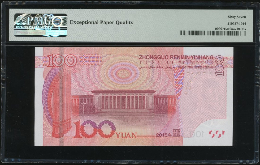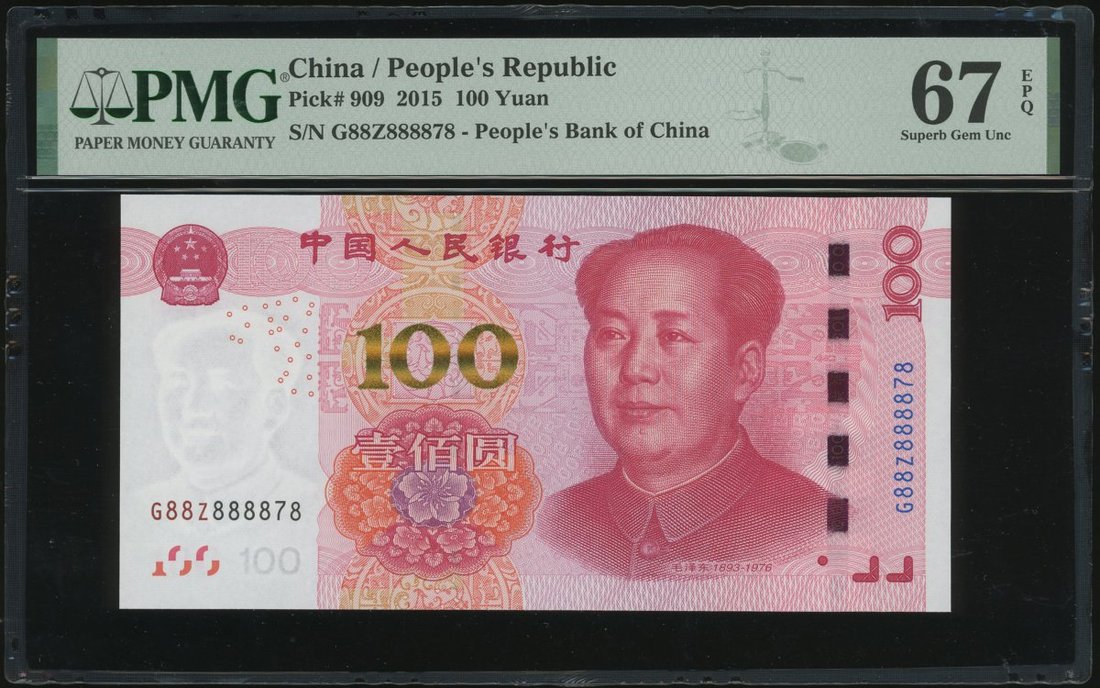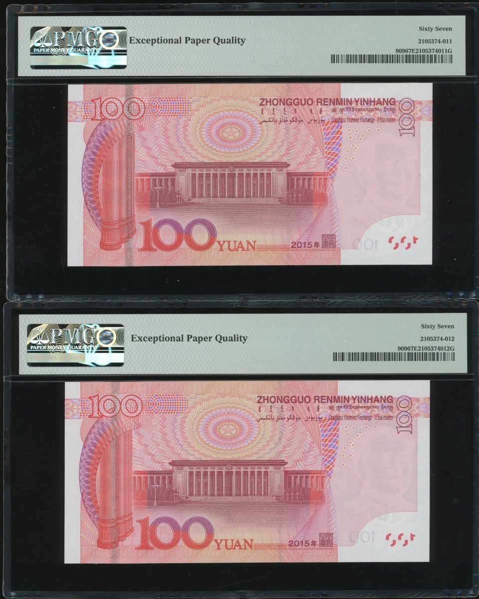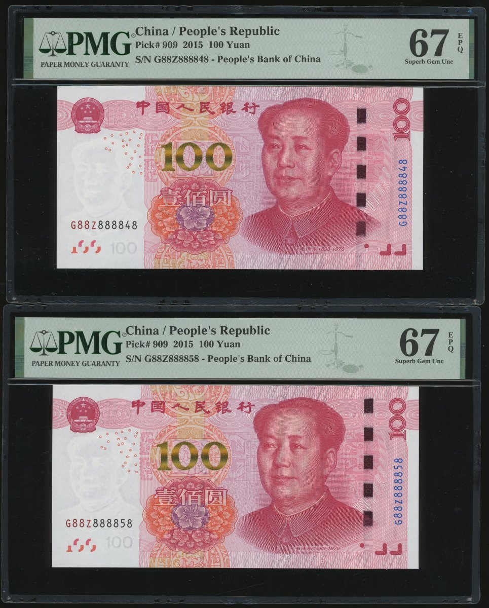 2015年中國人民銀行第五版人民幣壹佰圓一組3枚,趣味號G88Z888848,G88Z888858及G88Z888878,均PMG 67EPQ