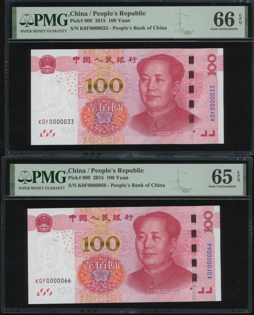 2015年中國人民銀行第五版人民幣壹佰圓一組3枚,細編號K0F0000033,66及99,分別PMG 66EPQ,65EPQ及67EPQ