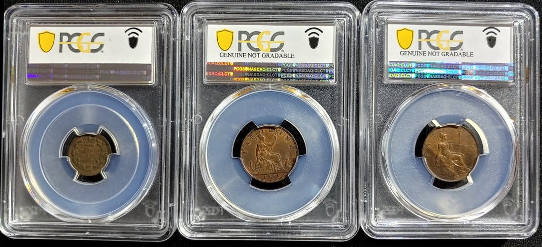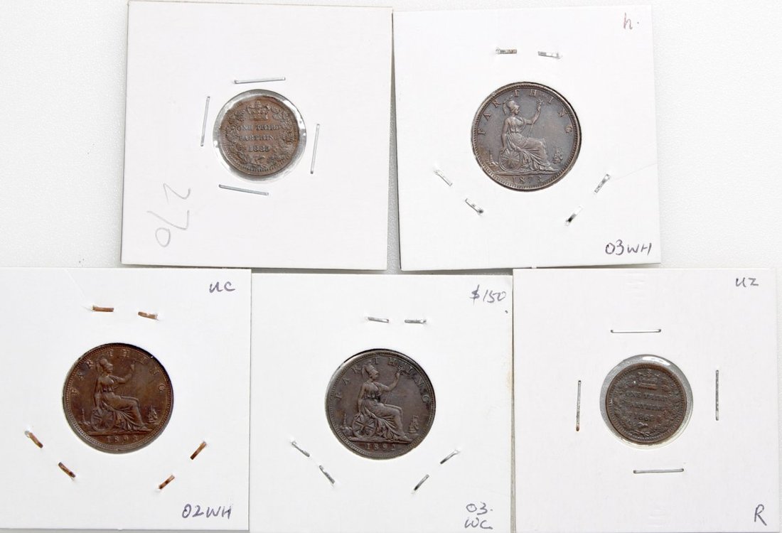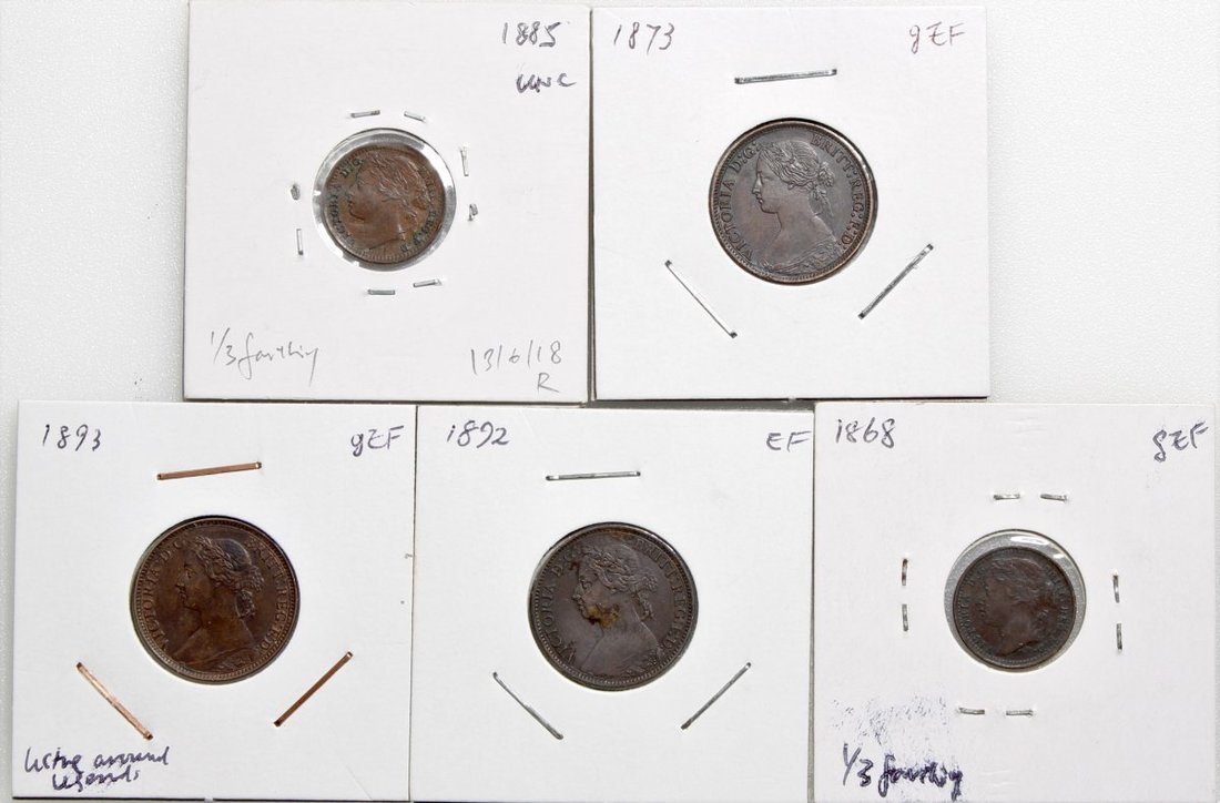 英國角分幣一組5枚,包括1868及1885年(2枚)1/3 法新銅幣,及1873,1881-H,18921893及1895年法新銅幣,3枚經PCGS評級,其餘EF或以上品相