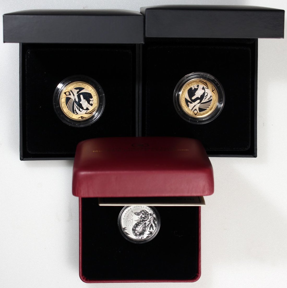 2012年英國2鎊加厚幣一對,及2013年加拿大蛇年精鑄銀幣20元,連原包裝及證書
