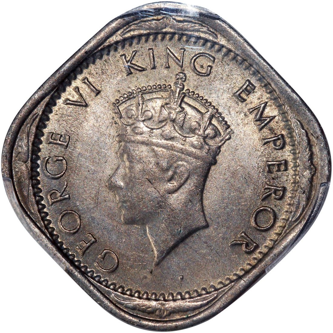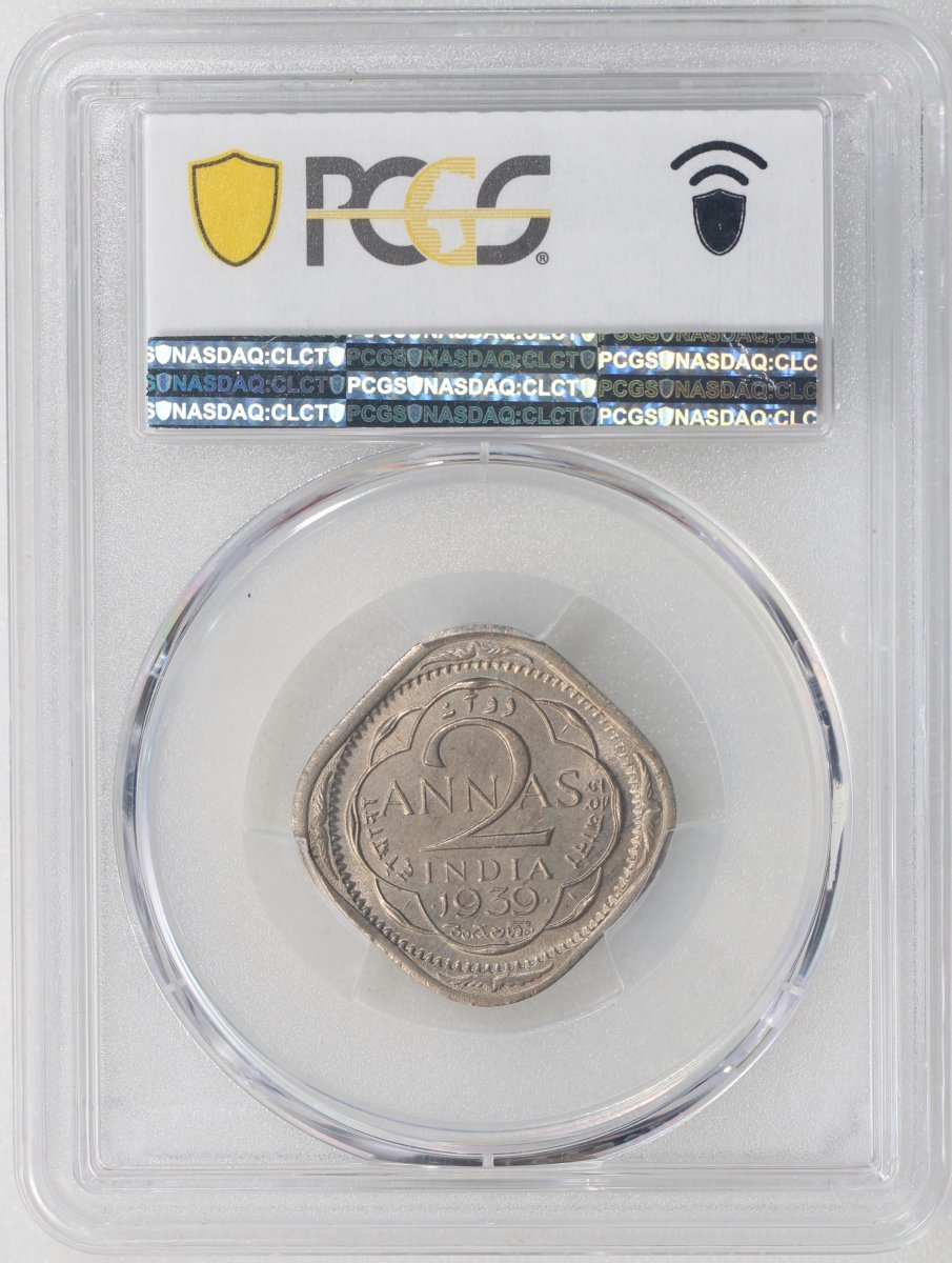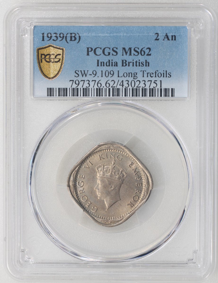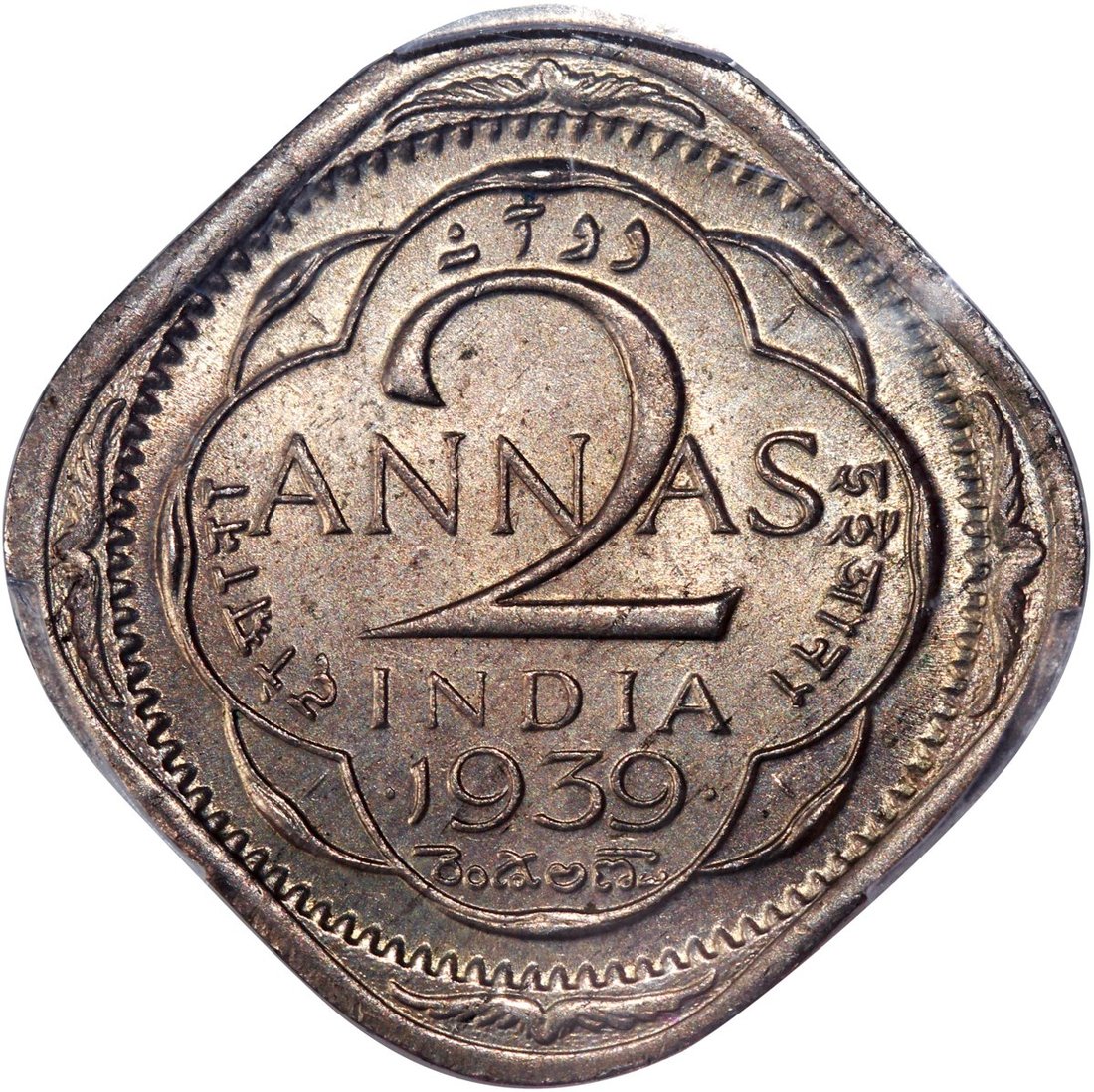 India, cupro nickel 2 anna, 1939-B, long refoils,