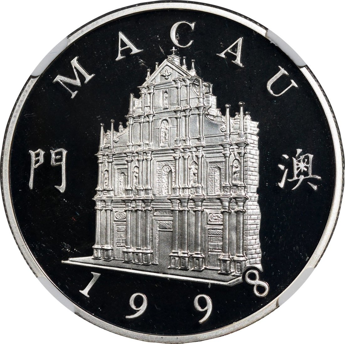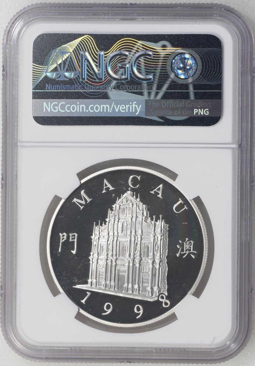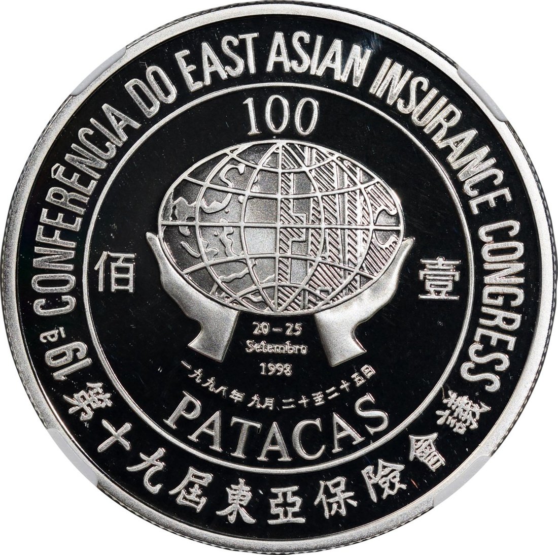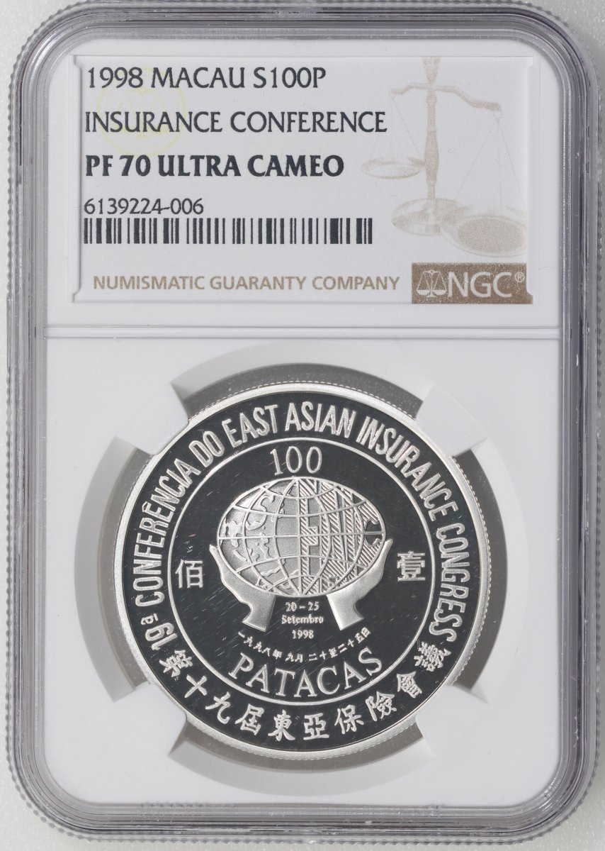 1998年澳門精鑄銀幣100元,第十九屆東亞保險會議紀念版,ASW0.84安士,NGC PF70 Ultra Cameo,#6139224-006,附原套裝及證書,僅發行3000枚