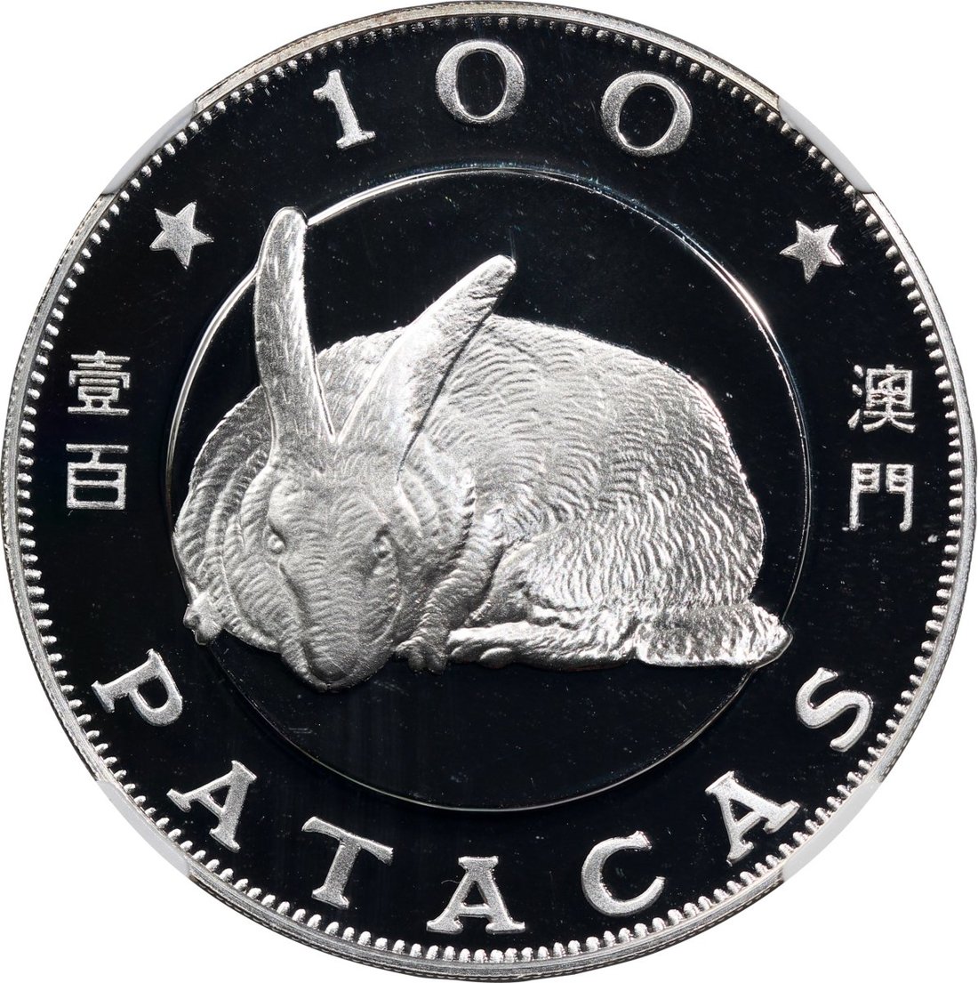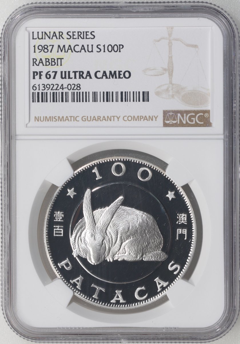 1987年澳門兔年精鑄生肖紀念銀幣100元,ASW0.84安士,NGC PF67 Ultra Cameo,#6139224-028,附原盒但不帶證書,發行5000枚