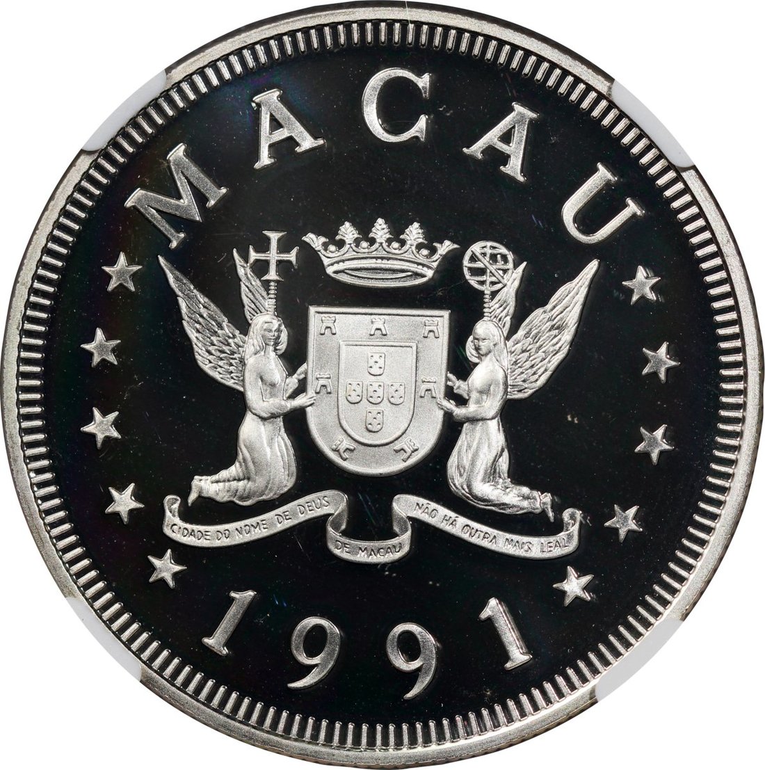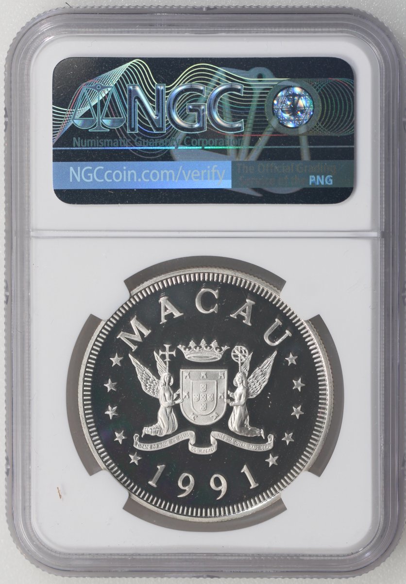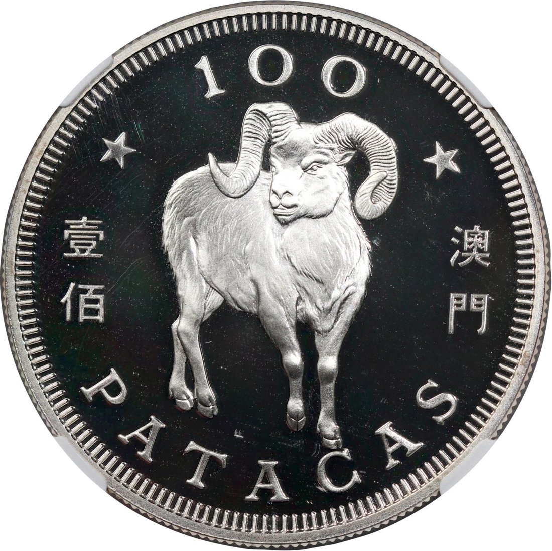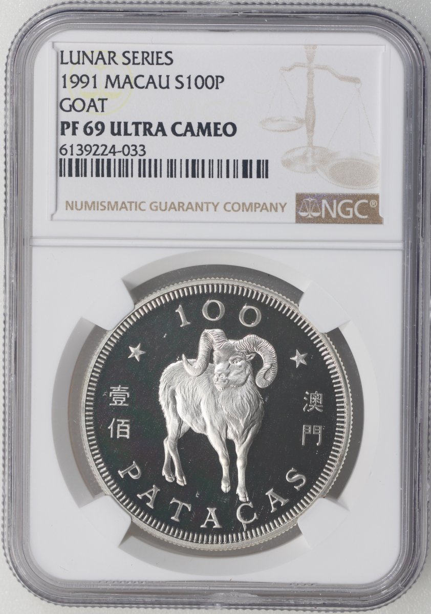 1991年澳門羊年精鑄生肖紀念銀幣100元,ASW0.84安士,NGC PF69 Ultra Cameo,#6139224-033,附原盒及證書,編號0154,發行5000枚