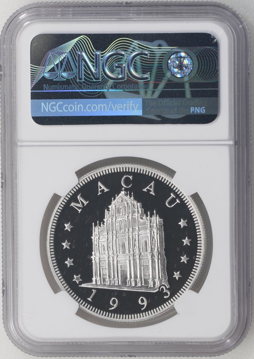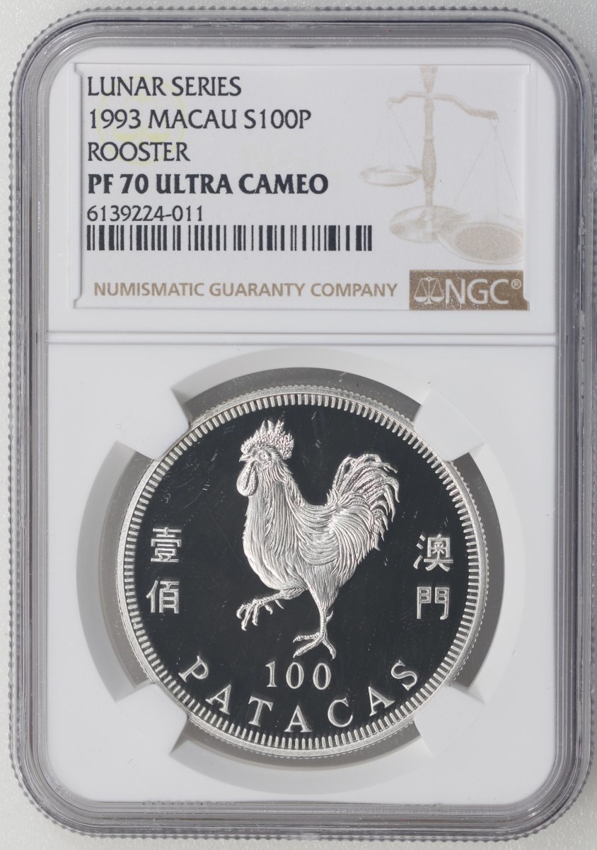 1993年澳門鷄年精鑄生肖紀念銀幣100元,ASW0.84安士,NGC PF69 Ultra Cameo,#6139224-011,附原盒及證書,編號2024,發行5000枚