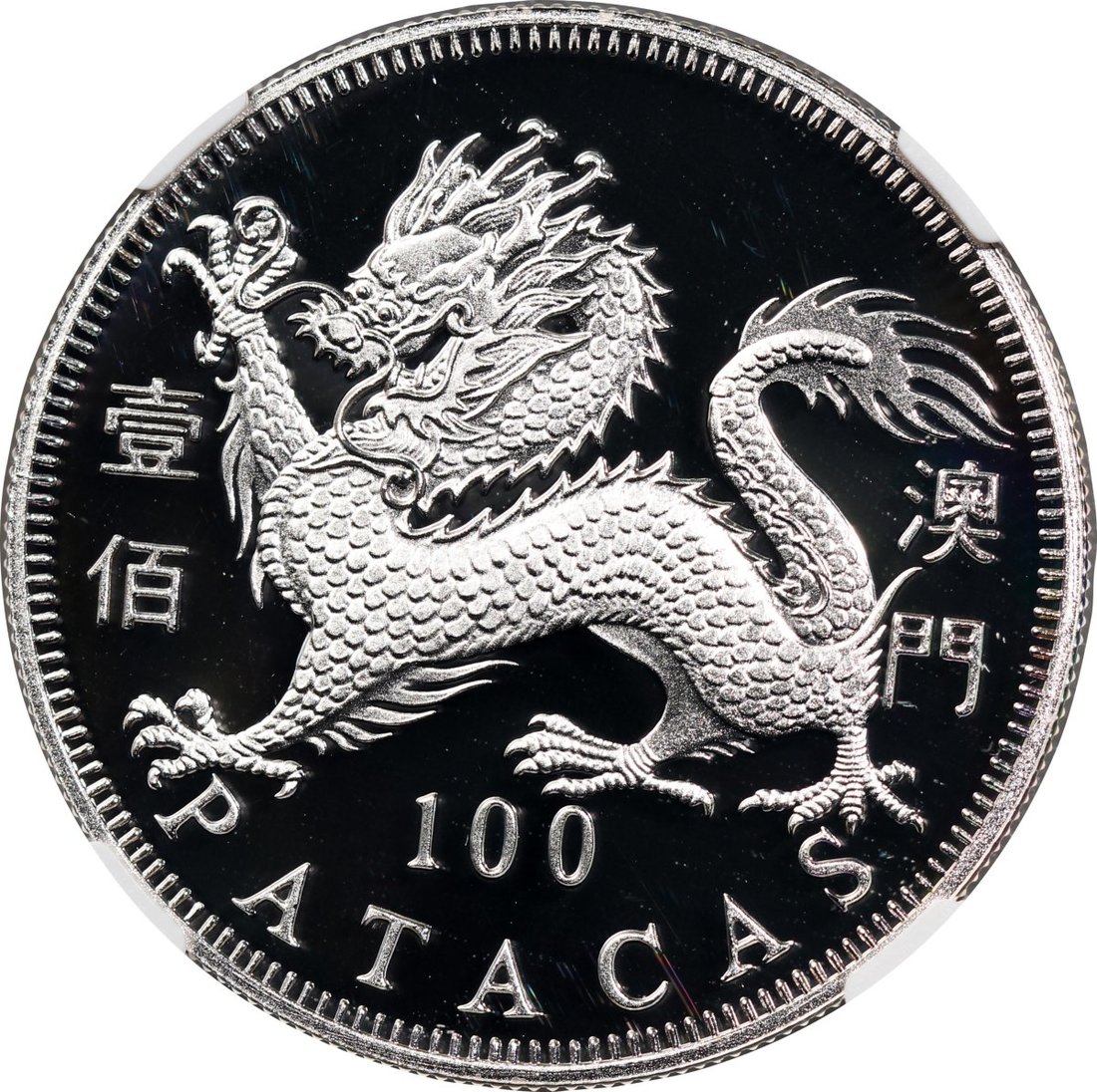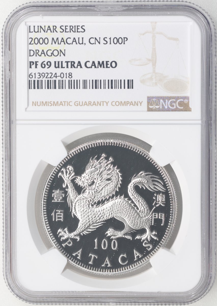 2000年澳門龍年精鑄生肖紀念銀幣100元,ASW0.84安士,NGC PF69 Ultra Cameo,#6139224-018,附原盒及證書,編號02602,發行5000枚