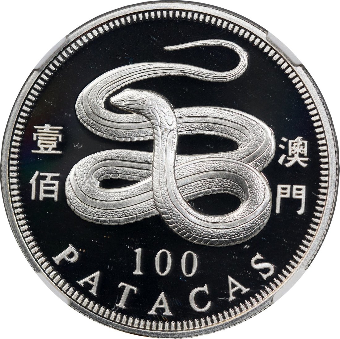 Macau, silver proof 100 Patacas, 2001, Year of the Snake, ASW 0.84oz,