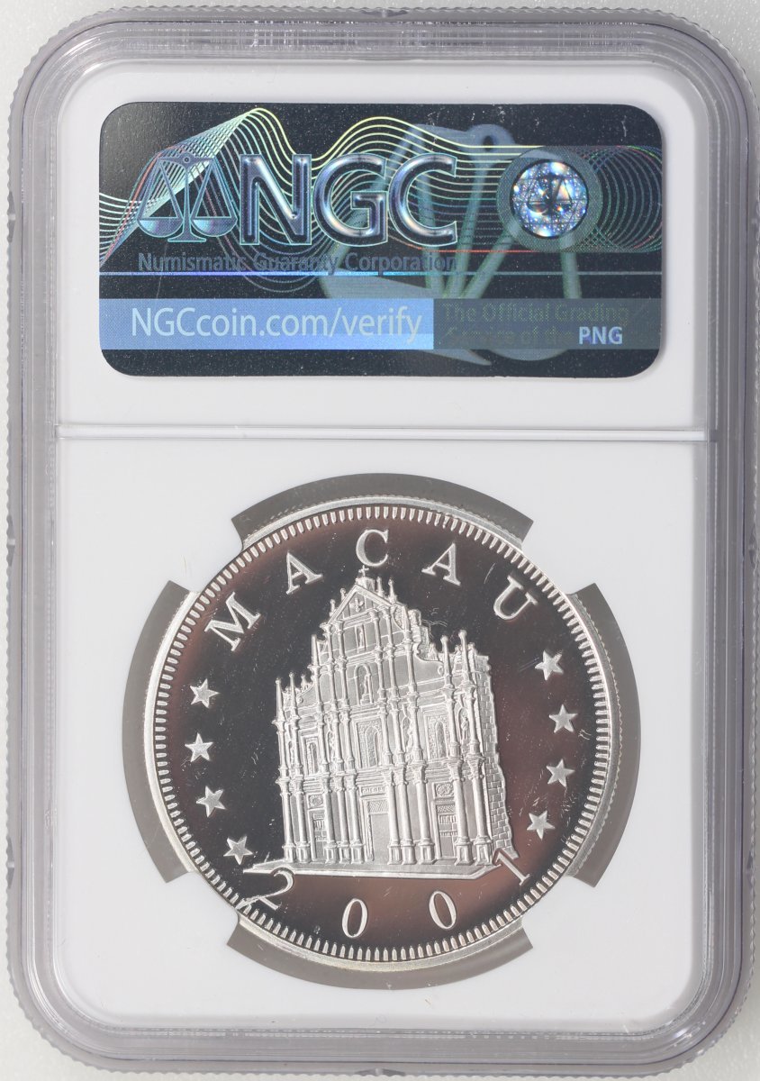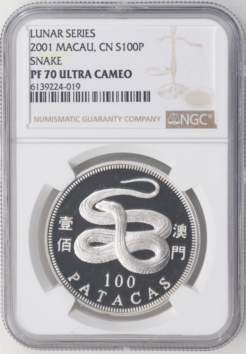 2001年澳門蛇年精鑄生肖紀念銀幣100元,ASW0.84安士,NGC PF70 Ultra Cameo,#6139224-019,附原盒及證書,編號02667,發行5000枚