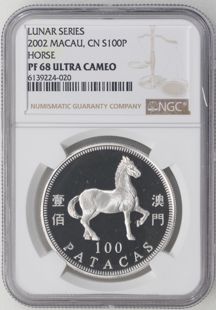 2002年澳門馬年精鑄生肖紀念銀幣100元,ASW0.84安士,NGC PF68 Ultra Cameo,#6139224-020,附原盒及證書,編號03170,發行5000枚