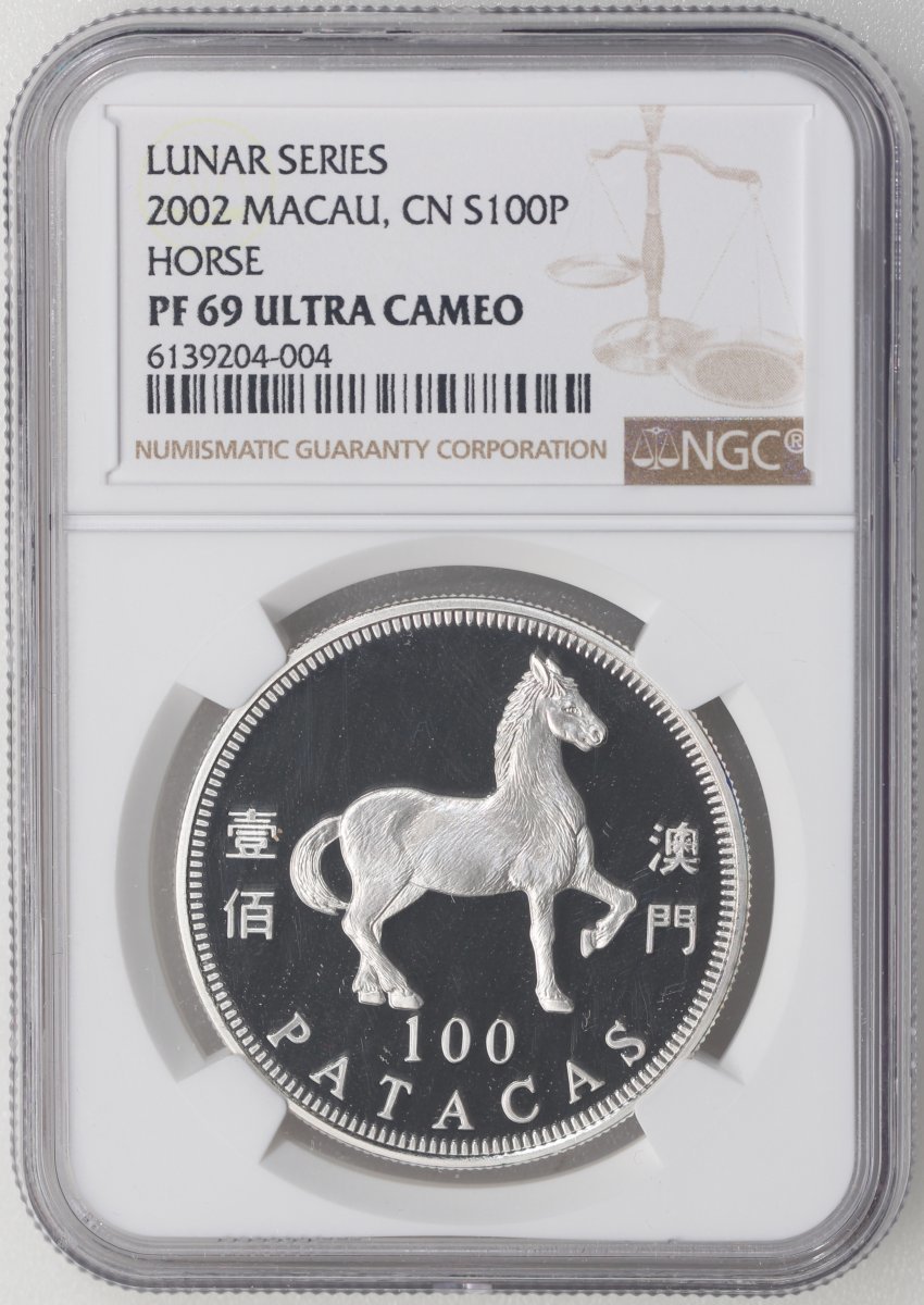 2002年澳門馬年精鑄生肖紀念銀幣100元,NGC PF69 Ultra Cameo,#6139204-004,連原盒及證書,發行僅5000枚