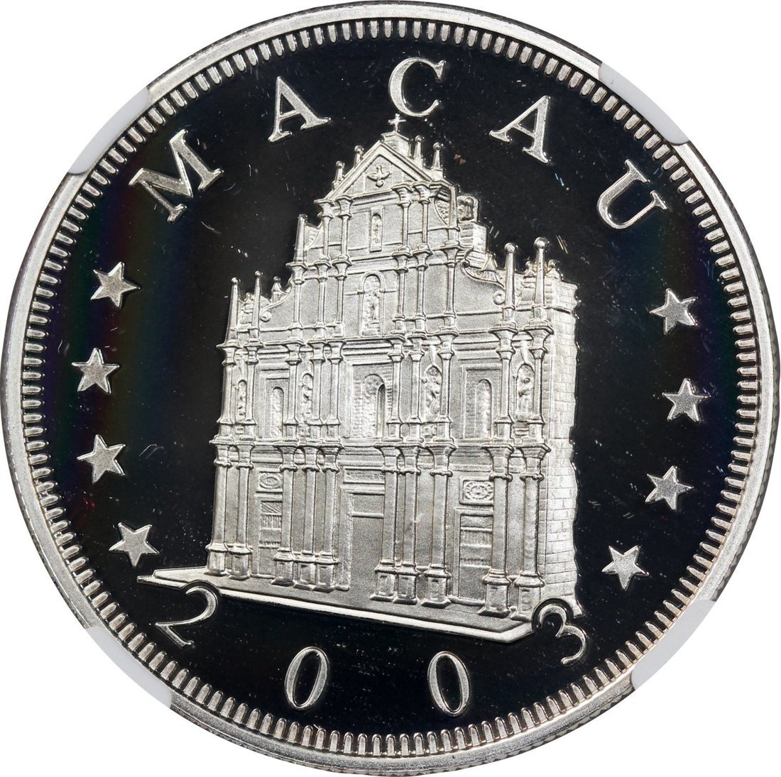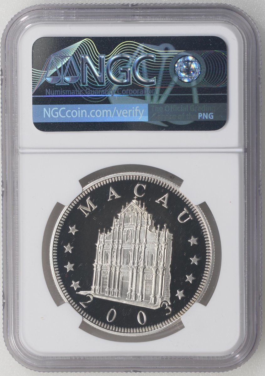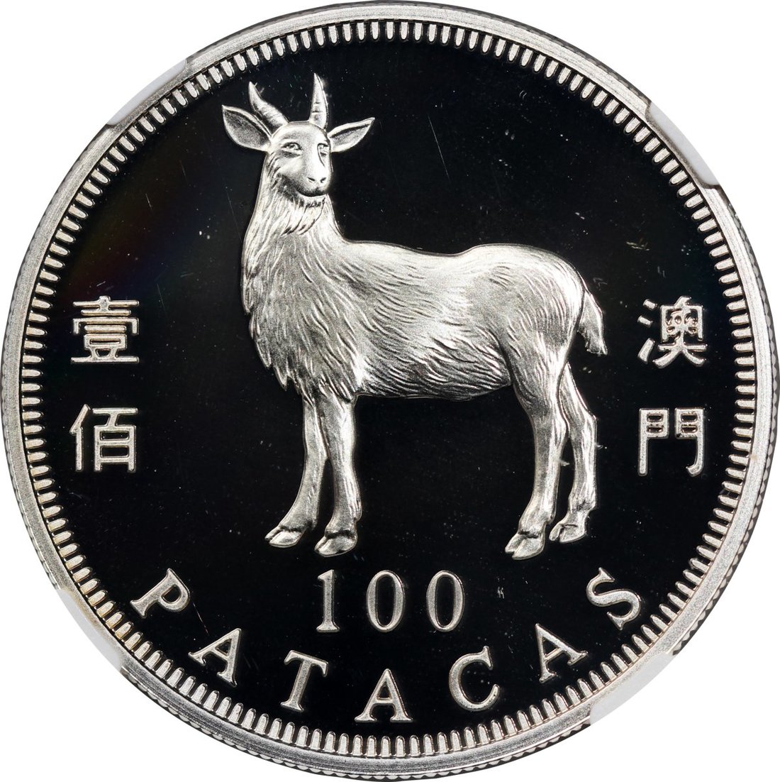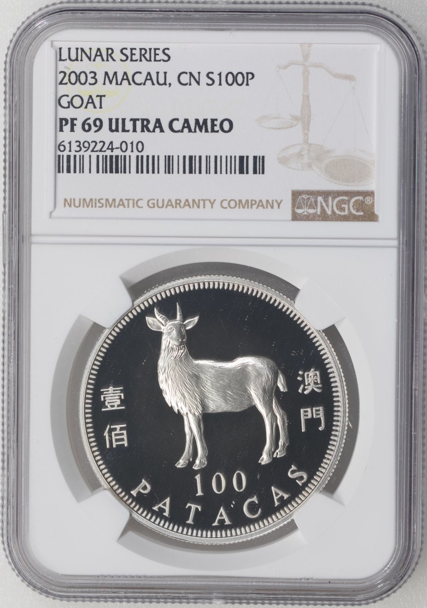 2003年澳門羊年精鑄生肖紀念銀幣100元,ASW0.84安士,NGC PF69 Ultra Cameo,#6139224-010,附原盒及證書,編號02861,發行5000枚