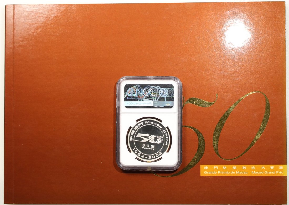 2003年澳門精鑄銀幣50元,格蘭披治大賽車50周年紀念,刻上號碼'000124',ASW 0.84安士,NGC PF69 Ultra Cameo,#6139229-037,附原包裝及證書,編號000124,僅發行1000枚,少見帶有刻印號碼版別
