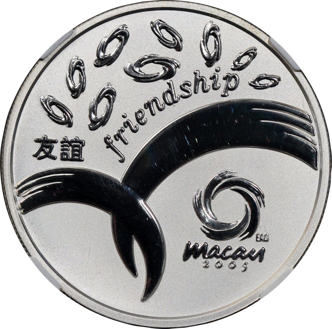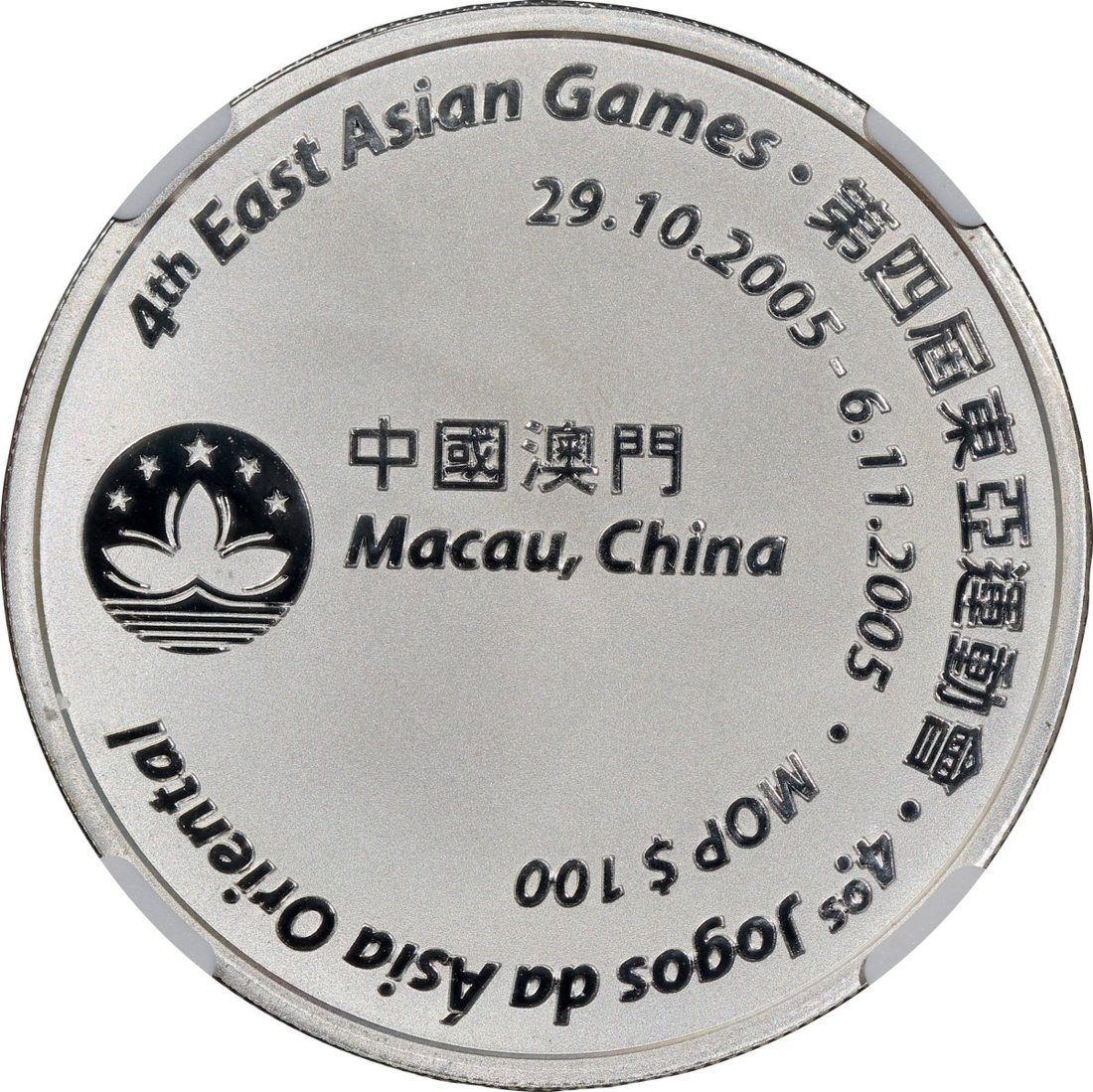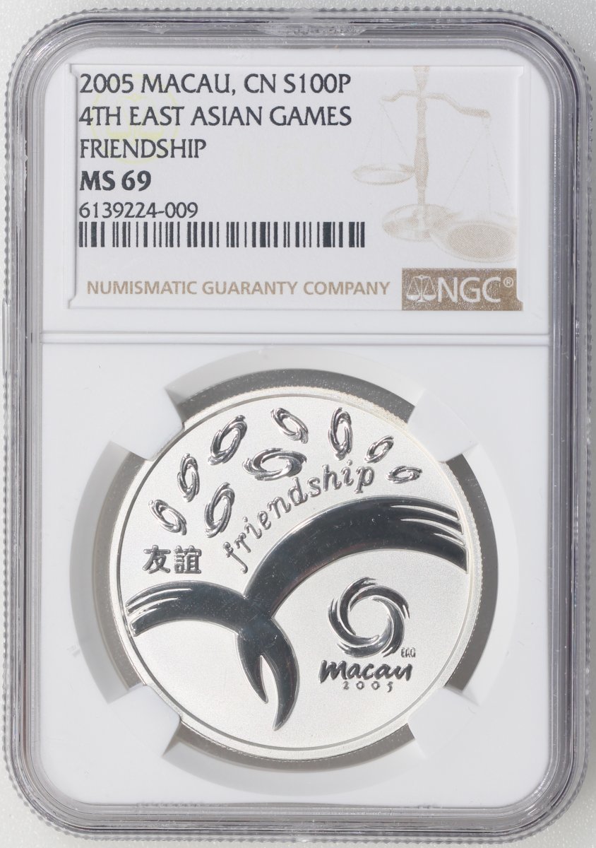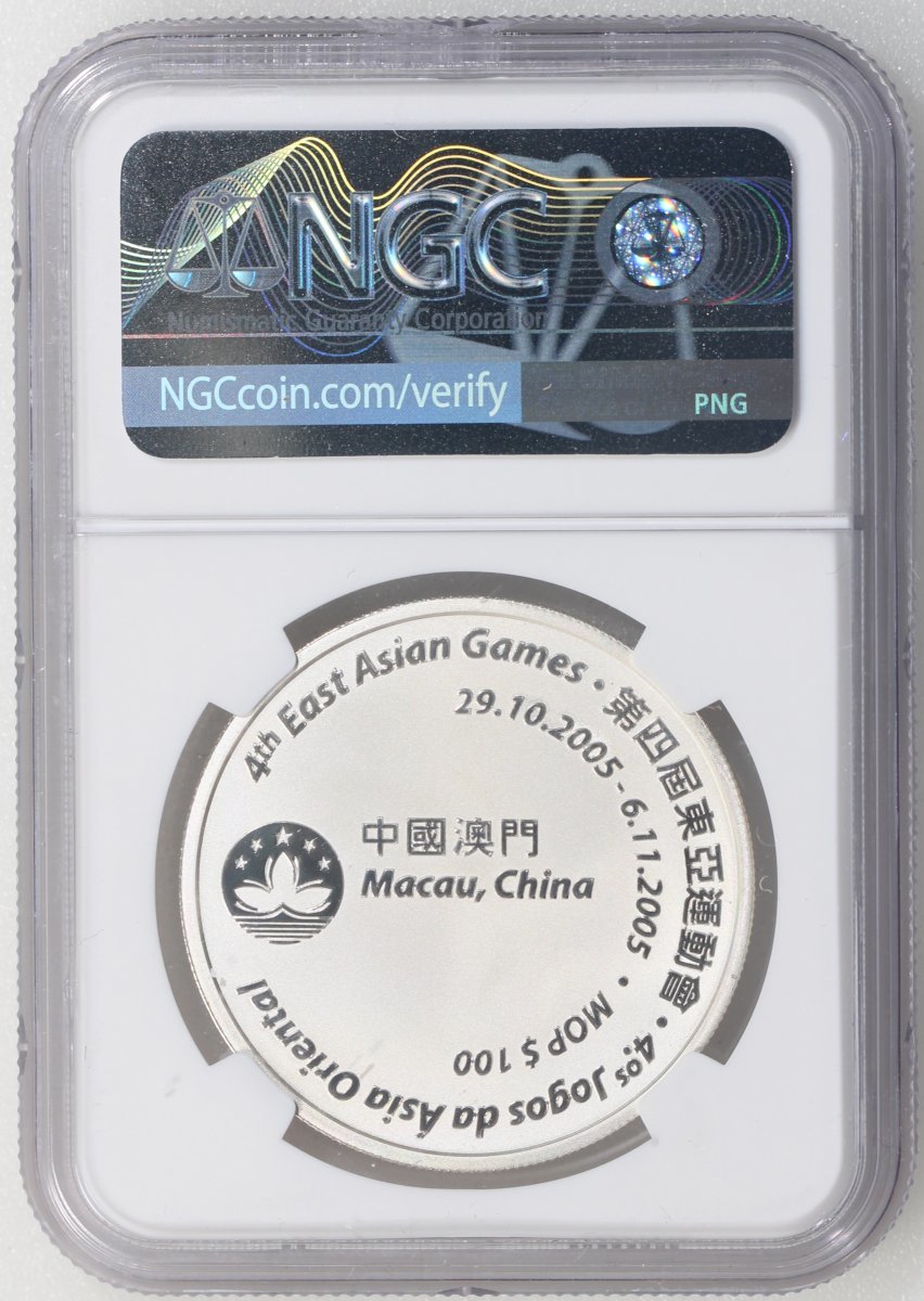 2005年澳門銀幣100元,第四屆東亞運動會紀念版,ASW0.84安士,NGC MS69,#6139224-009,附原套裝及證書,編號SPR000448,發行6000枚