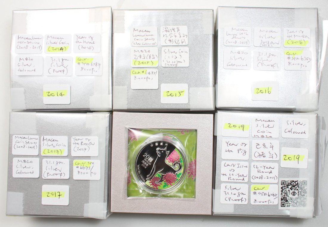 Macau, group of 6x coloured silver proof 20 Patacas, 2014-2019, ASW 6oz,
