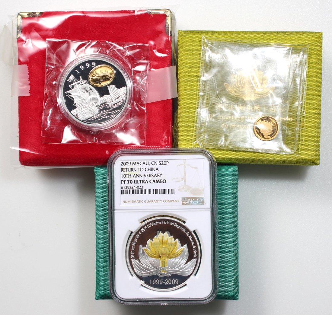 澳門紀念幣一組3枚,包括1999年精鑄鍍金銀幣100元,澳門特別行政區成立紀念,2009年彩色精鑄銀幣20元及精鑄金幣50元,澳門特別行政區成立10周年紀念,ASW2安士及AGW0.04安士,proof FDC,20元銀幣評NGC PF70 Ultra Cameo,#6139224-023,附原盒及證書
