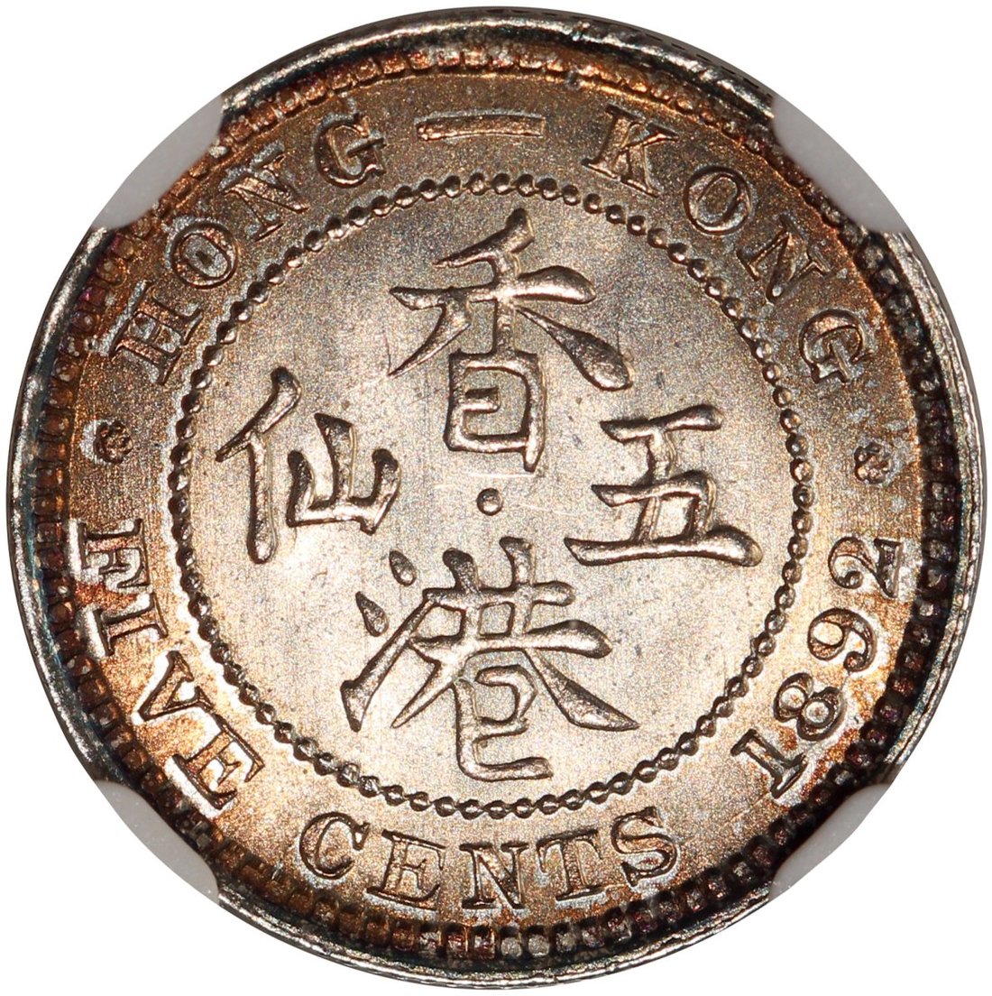 Hong Kong, silver 5 cents, 1892, NGC MS63, with golden brown toning, #6137925-002.