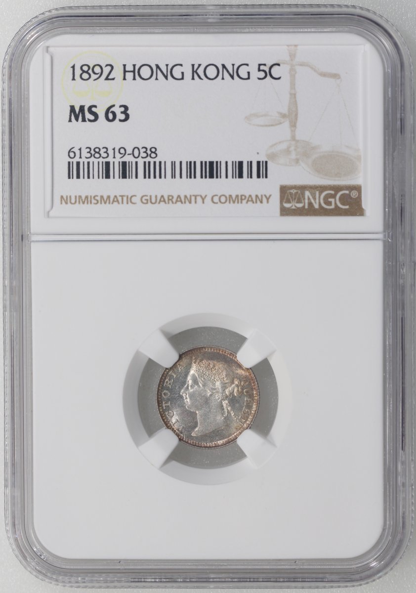 1892年香港5仙,NGC MS63,幣邊帶金黃包漿,#6138319-038
