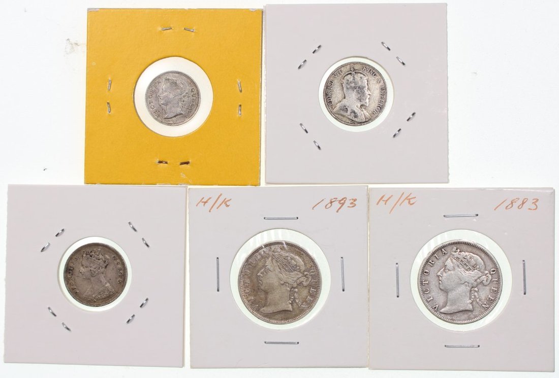 香港錢幣一組5枚,包括1901年1仙,1901及02年1毫各一枚,及1893年2毫2枚,F至EF,建議預覽